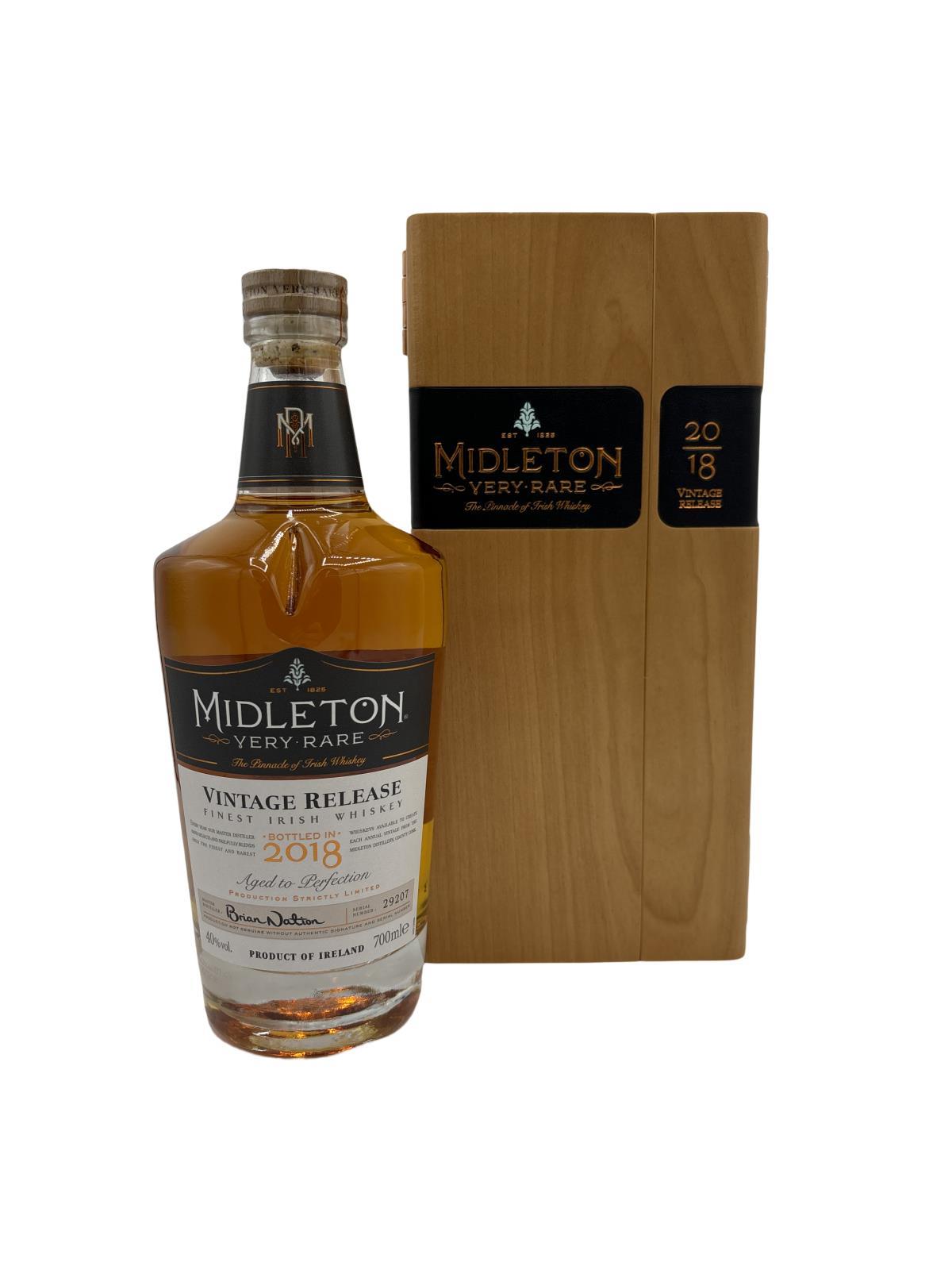 The Midleton Very Rare 2018, is a bottling brought out by the Midleton Distillery in Co. Cork. The ‘Midleton Very Rare’ range was launched in 1984 and a new vintage has been released every year since then. Barry Crockett started off the ‘Midleton Very Rare’ range while he was the Master Distiller of Midleton Distillery, in 2013 Barry Crockett retired from his role of Master Distiller. From 2014 onwards Brian Nation has been creating the ‘Midleton Very Rare’ range, maintaining its role as standard-bearer and pinnacle of Irish Whiskey. The bottle and gift box in great condition also include the cert and distillery invite. Old bottle style and label.The Midleton Very Rare range of whiskeys is a collection of highly regarded Irish whiskeys crafted at the Midleton Distillery in County Cork, Ireland. With a reputation for excellence, these whiskeys are known for their exceptional quality, craftsmanship, and limited availability. Characterized by smoothness, complexity, and depth of flavour, Midleton Very Rare often exhibits notes of ripe fruits, honey, vanilla, spices, and oak. The component casks are typically aged for around 12-27 years but each yearly batch is unique and for this reason the whiskeys are highly collectible. To this day the Midleton Very Rare series is still regarded as the pinnacle and benchmark for ultra-premium blended Irish whiskeys.