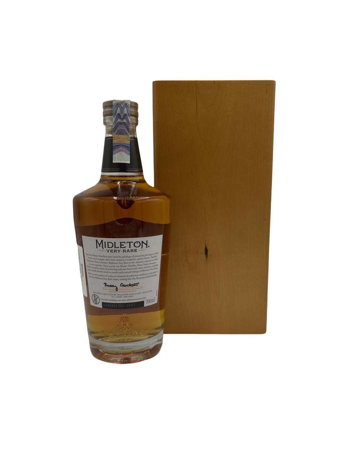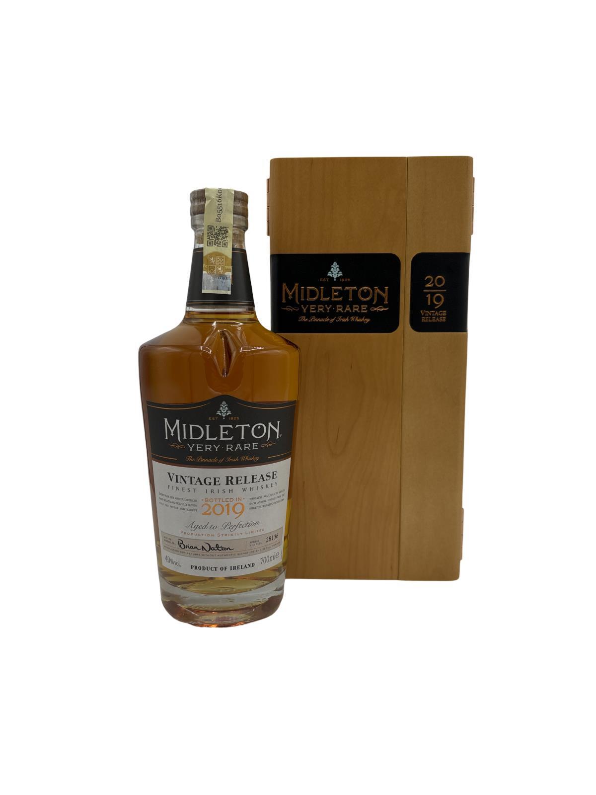 The Midleton Very Rare 2019, is a bottling brought out by the Midleton Distillery in Co. Cork. The ‘Midleton Very Rare’ range was launched in 1984 and a new vintage has been released every year since then. Barry Crockett started off the ‘Midleton Very Rare’ range while he was the Master Distiller of Midleton Distillery, in 2013 Barry Crockett retired from his role of Master Distiller. From 2014 onwards Brian Nation has been creating the ‘Midleton Very Rare’ range, maintaining its role as standard-bearer and pinnacle of Irish Whiskey. The bottle and gift box in great condition also include the cert and distillery invite. Old bottle style and label.The Midleton Very Rare range of whiskeys is a collection of highly regarded Irish whiskeys crafted at the Midleton Distillery in County Cork, Ireland. With a reputation for excellence, these whiskeys are known for their exceptional quality, craftsmanship, and limited availability. Characterized by smoothness, complexity, and depth of flavour, Midleton Very Rare often exhibits notes of ripe fruits, honey, vanilla, spices, and oak. The component casks are typically aged for around 12-27 years but each yearly batch is unique and for this reason the whiskeys are highly collectible. To this day the Midleton Very Rare series is still regarded as the pinnacle and benchmark for ultra-premium blended Irish whiskeys.