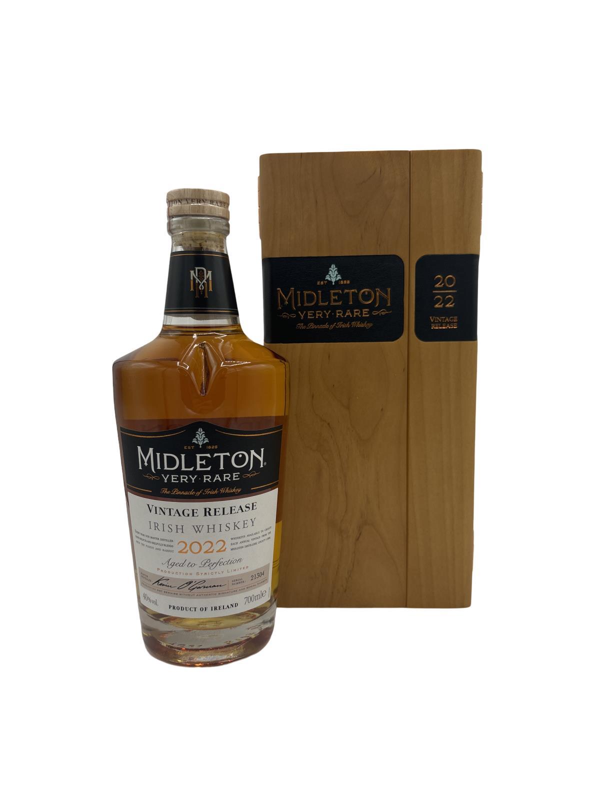 The 2022 edition to Ireland's most premium and beloved whiskey series; Midleton Very Rare. This is the 39th installment and the first release under Kevin O' Gorman appointed Master Distiller of the Midleton Distillery in 2020. Both the bottle and gift box are in very good condition, certificate and distillery invite are also included. The Midleton Very Rare range of whiskeys is a collection of highly regarded Irish whiskeys crafted at the Midleton Distillery in County Cork, Ireland. With a reputation for excellence, these whiskeys are known for their exceptional quality, craftsmanship, and limited availability. Characterized by smoothness, complexity, and depth of flavour, Midleton Very Rare often exhibits notes of ripe fruits, honey, vanilla, spices, and oak. The component casks are typically aged for around 12-27 years but each yearly batch is unique and for this reason the whiskeys are highly collectible. To this day the Midleton Very Rare series is still regarded as the pinnacle and benchmark for ultra-premium blended Irish whiskeys.