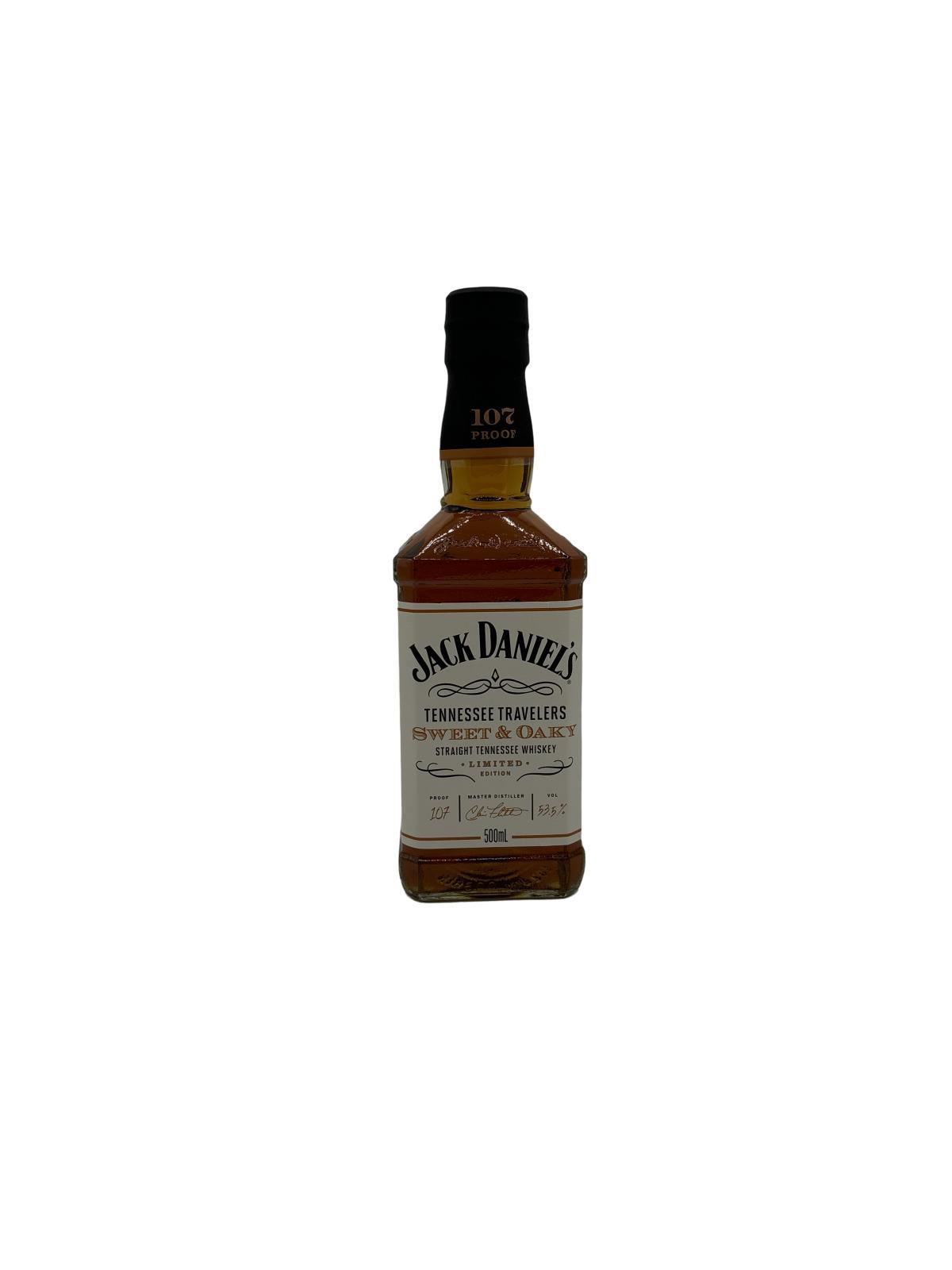 Jack Daniel's Tennessee Travelers Sweet & Oaky has a traditional 107 proof that intensifies the flavor and not the heat. The flavor is derived from the NEW American charred oak barrels. The mash is comprised of 80% Corn, 12% Barley, 8% Rye.