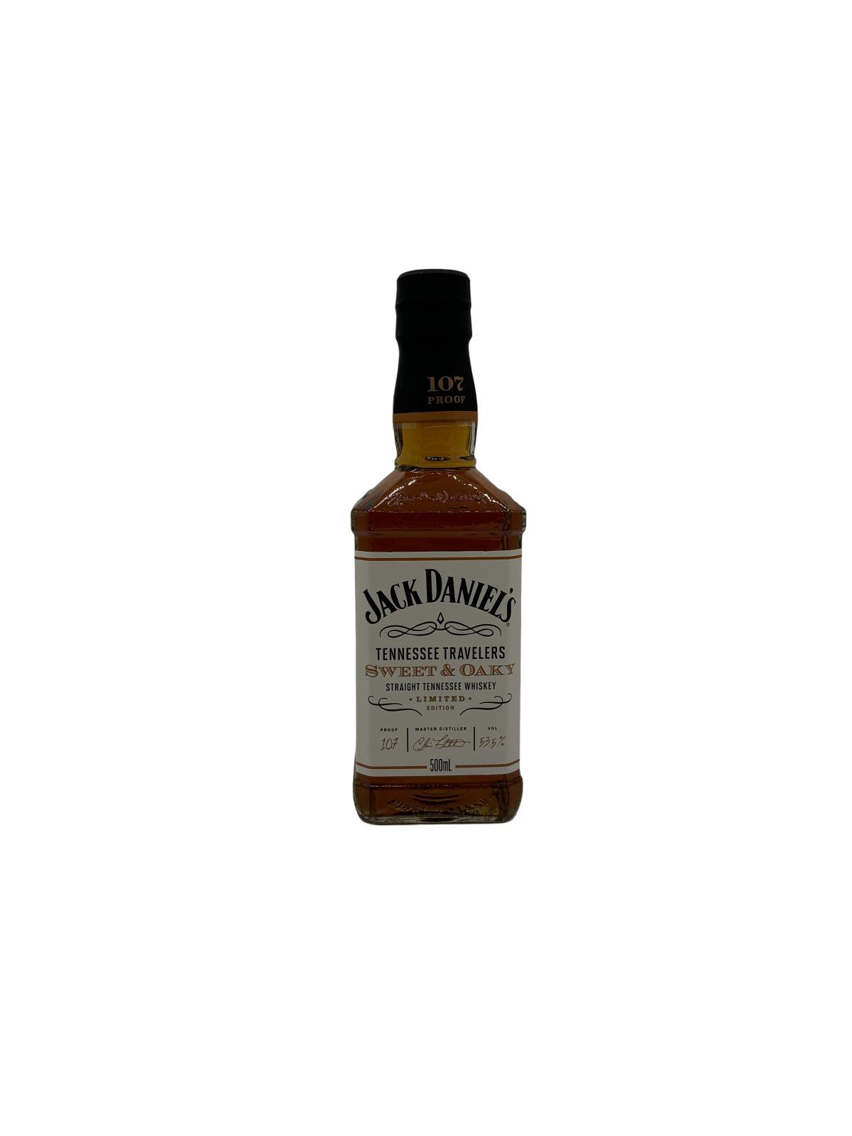 Jack Daniel's Tennessee Travelers Sweet & Oaky has a traditional 107 proof that intensifies the flavor and not the heat. The flavor is derived from the NEW American charred oak barrels. The mash is comprised of 80% Corn, 12% Barley, 8% Rye.