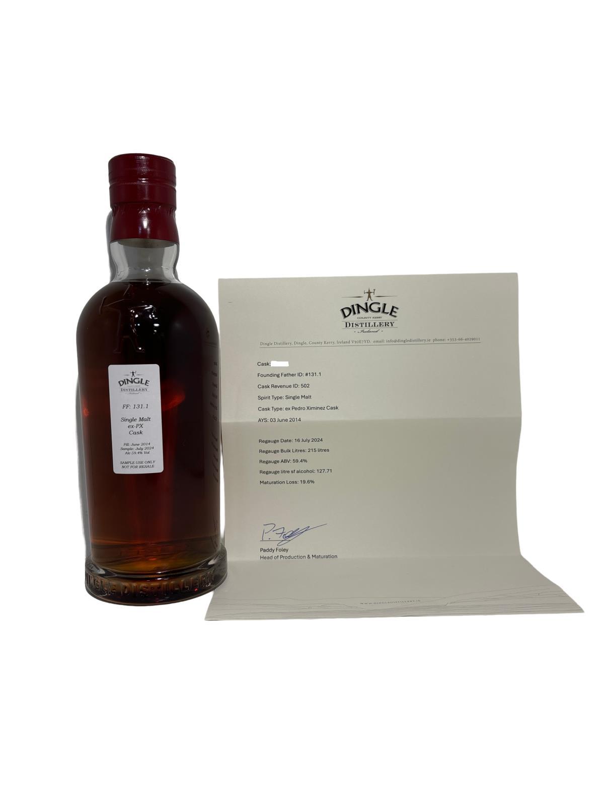 A rare opportunity to own a cask of 10 Year-Old Dingle Single Malt! 2014 (Cask filled on 3rd June 2014) Dingle Distillery Single Malt. It has been fully matured in a 250 litre Pedro Ximinez Sherry cask and it's current bulk litre and strength is 'Regauge taken by Dingle Distillery on 16th July 2024 gives a vol of 215 bulk litres at 59.4% abv'. All bidders must read & agree to the terms & conditions from Dingle Distillery. This gives the option of remaining part of the Founding Father programme (with revised terms) or removing the cask from Dingle Distillery and moving (at your expense) to an alternative bonded warehouse. However, please read carefully so you can see associated charges with each option. We have duty paid for a 70cl sample from this cask prior to the regauge and potential buyers can purchase a sample for €10 (plus shipping if required). All money collected from samples will be donated to Debra Ireland. Samples can purchased/ordered by emailing Jack@celticwhiskeyauction.com or instore at Celtic Whiskey Shop, 27-28 Dawson Street, Dublin 2.