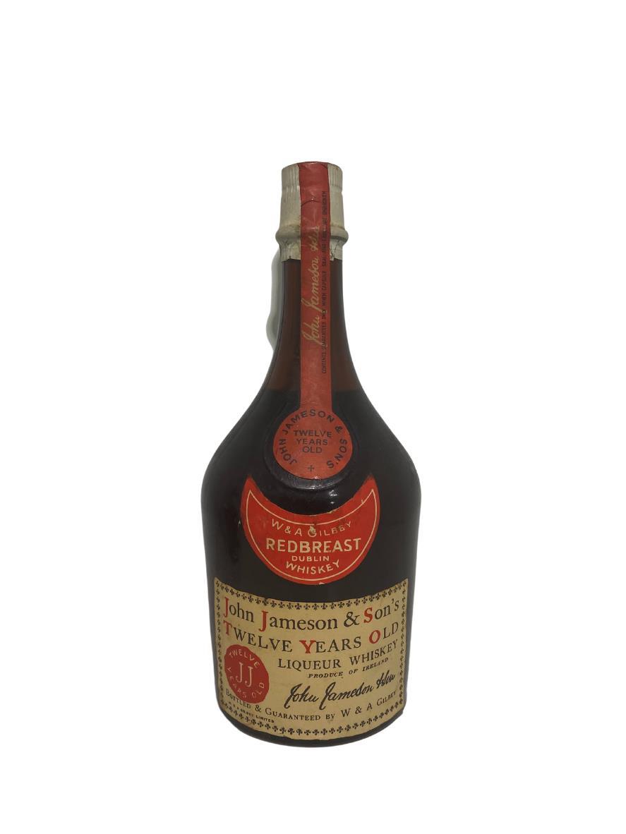 This is an old bottle of Redbreast John Jameson 'Liqueur Whiskey'- a term used in those days to describe a whiskey of superior quality. Bottled by Gilbeys, this most likely dates from the 1960s and is good condition. There is a little wear and tear to the label, the fill level is above the shoulder and just below the neck of the bottle.