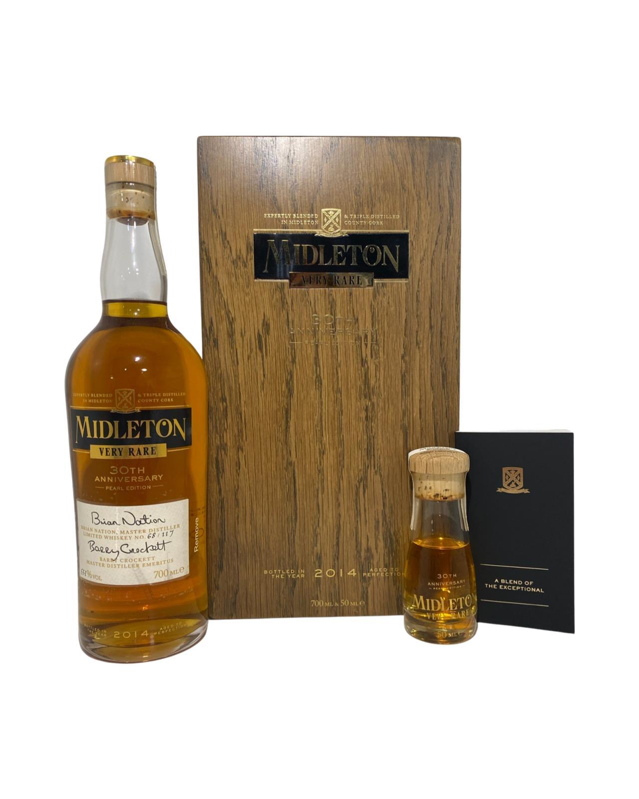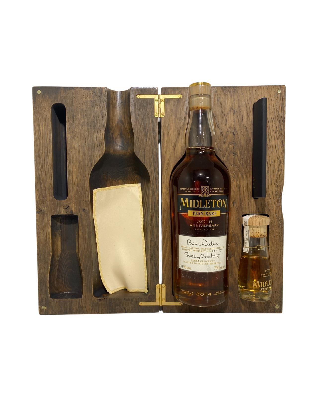 This is an incredible Midleton whiskey that was released to celebrate 30 years - the pearl anniversary - of the Very Rare range of blends. A collaboration between retired master distiller Barry Crockett and new master distiller Brian Nation, each bottle carries a signature of both men. Two casks were selected, one a single pot still cask from 1984 and the other a single grain from 1981. These were then married for six months in a fourth-fill Bourbon barrel which eventually yielded just 117 bottles of sublime Irish whiskey! Apparently the Midleton distillery had a massive clearout of old casks during the 1980s when they moved onto a stricter wood selection and cask management scheme. Therefore barrels from this era are incredibly rare and unlikely to crop up again. Great care went into the high-end packaging and presentation. Each bottle is hand-blown at Jerpoint Glass in Kilkenny and a miniature is also supplied for tasting purposes. The oak box which hugs the bottle very neatly was crafted in County Wexford.