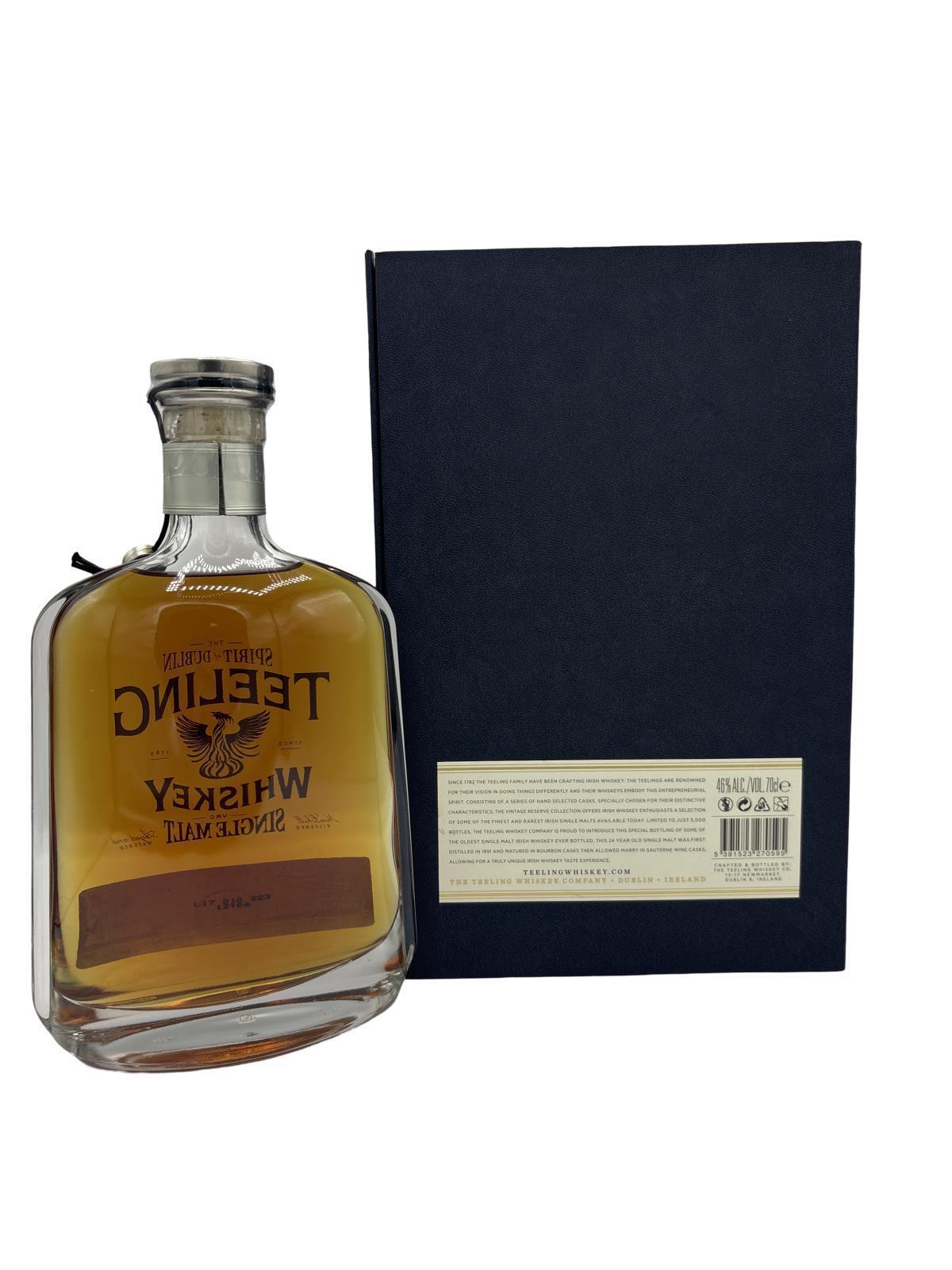 The Teeling 24 Year Old Single Malt Irish Whiskey was first distilled in 1991 and matured in Bourbon casks then allowed marry in Sauternes wine casks producing a wholly unique taste experience. The unique dual maturation imparts an extra depth of fruit flavours that perfectly complement the hint of smoke derived from the inclusion of a small portion of Peated malt as part of the original ingredients used in production. This small batch bottling, limited to just 5,000 70cl bottles, were hand bottled in unique decanter bottles and come with their own certificate of authenticity.