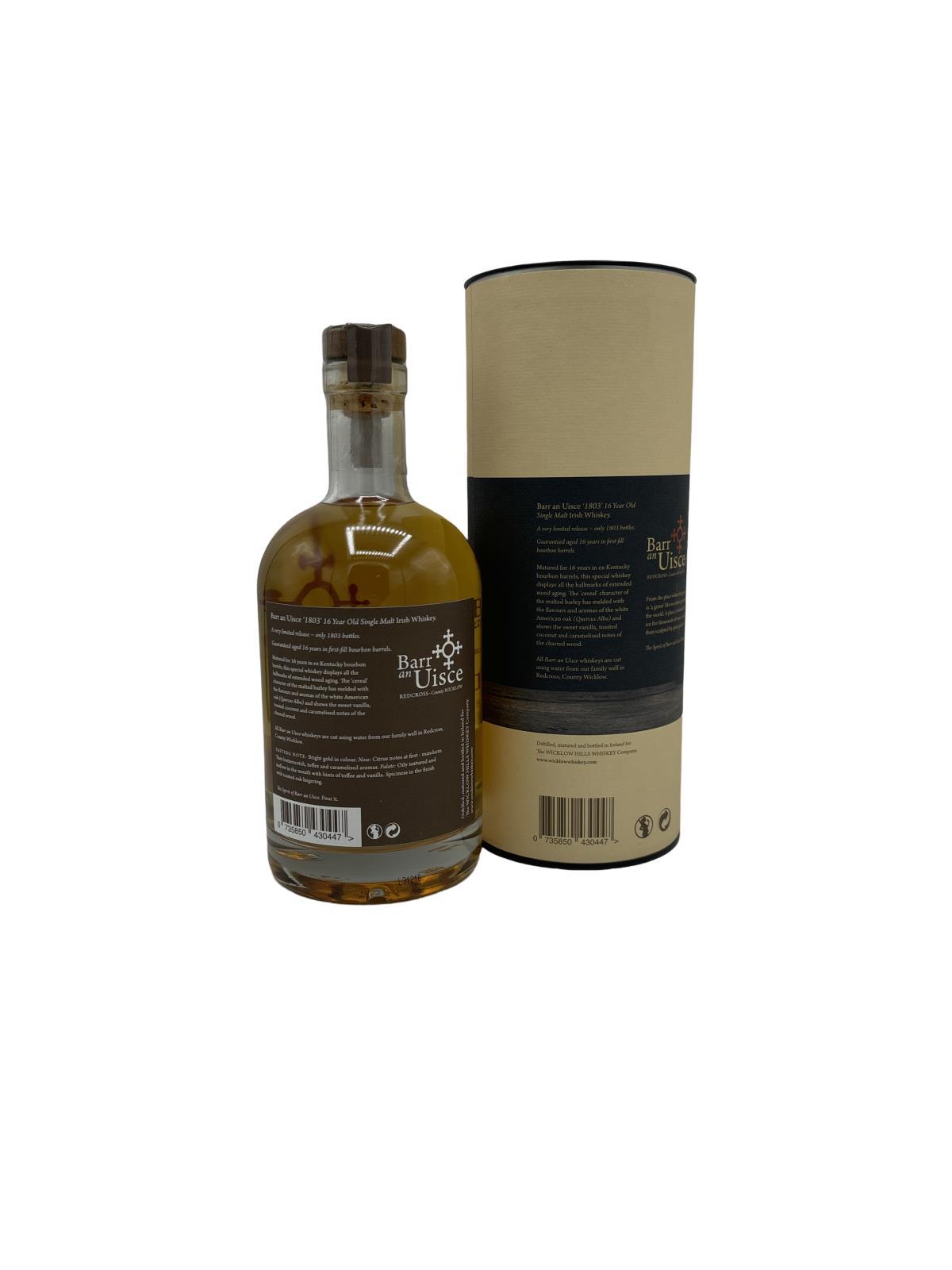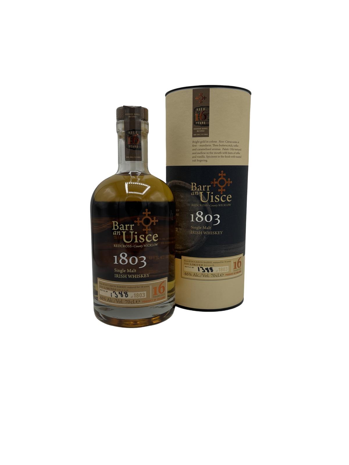 A limited edition 16 Year Old whiskey from Barr an Uisce that has been matured in first fill Bourbon barrels. Only 1803 bottles were produced and all of these have been numbered by hand.