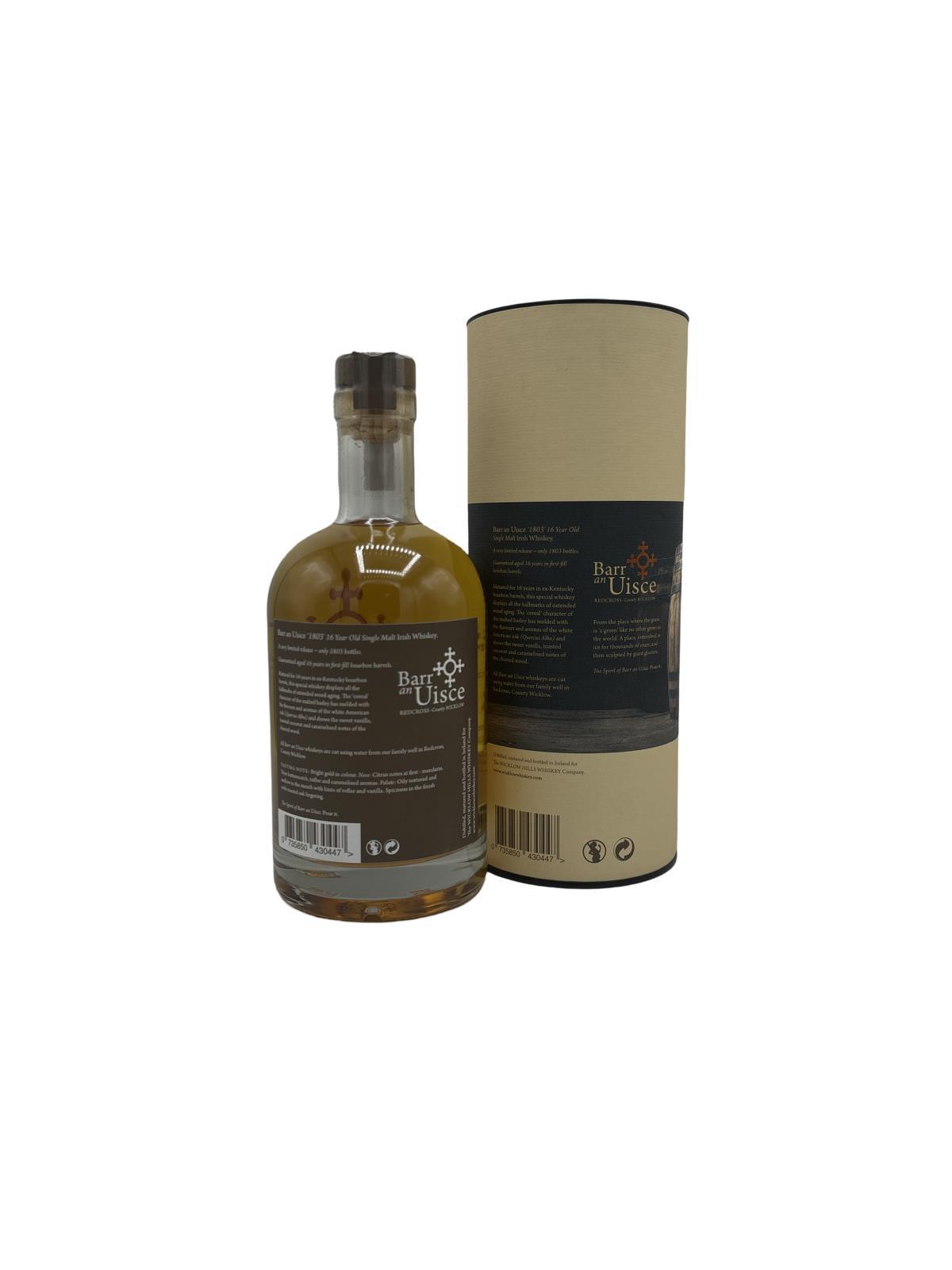 A limited edition 16 Year Old whiskey from Barr an Uisce that has been matured in first fill Bourbon barrels. Only 1803 bottles were produced and all of these have been numbered by hand.