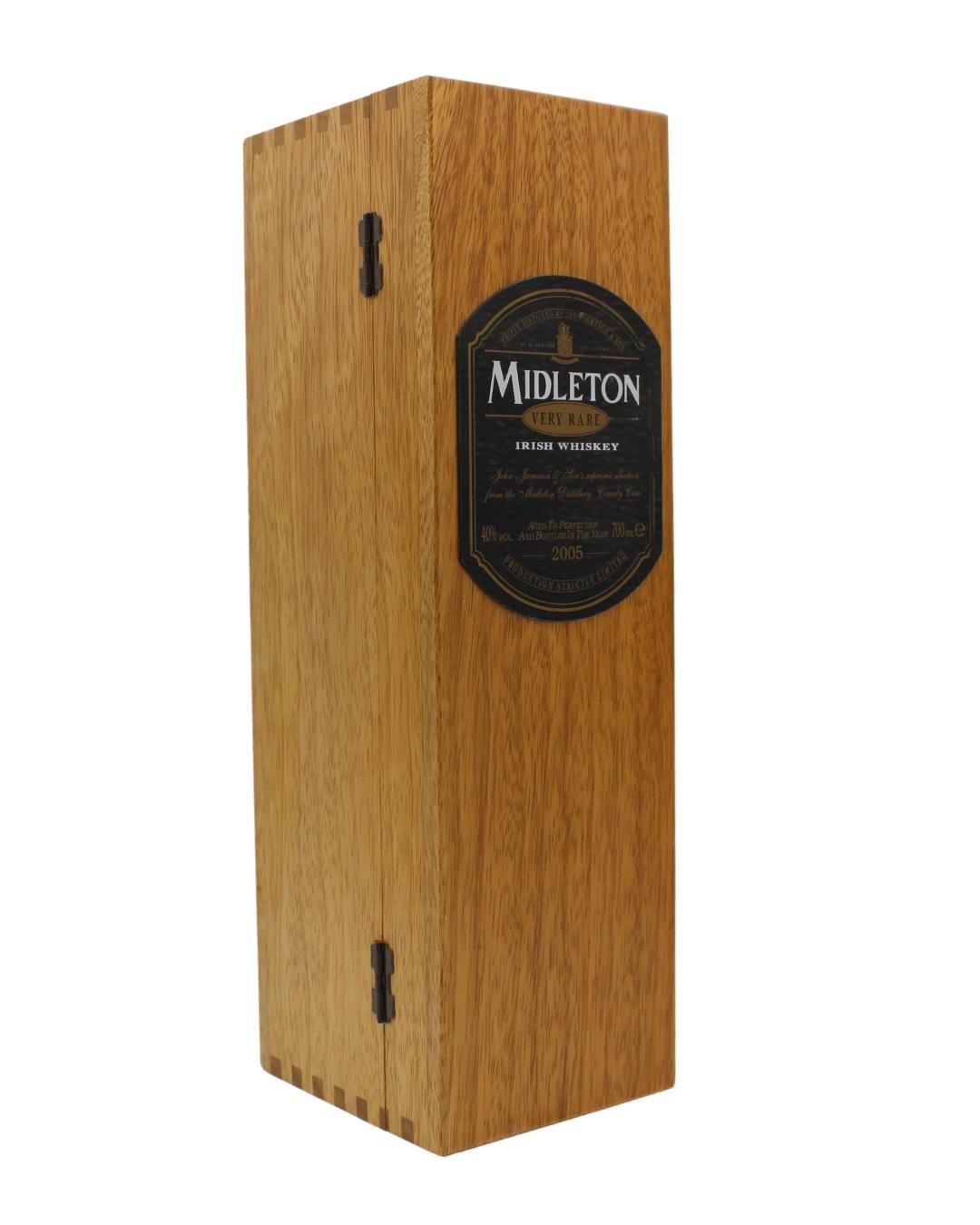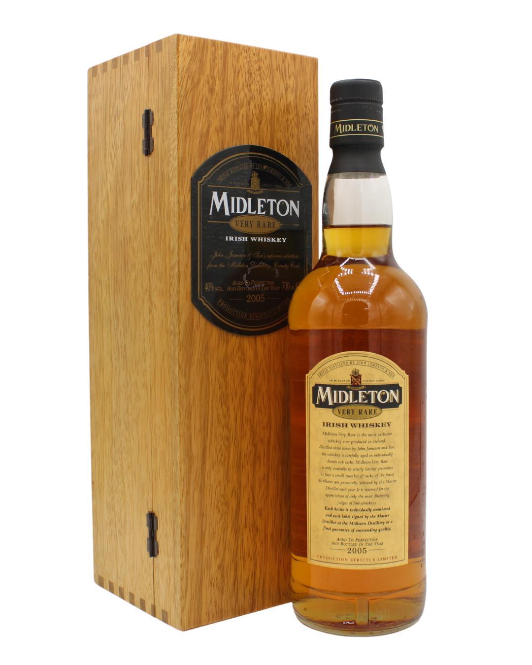 The Midleton Very Rare 2005, is a bottling brought out by the Midleton Distillery in Co. Cork. The ‘Midleton Very Rare’ range was launched in 1984 and a new vintage has been released every year since then. Barry Crockett started off the ‘Midleton Very Rare’ range while he was the Master Distiller of Midleton Distillery.The Bottle and Box are in good condition. The Midleton Very Rare range of whiskeys is a collection of highly regarded Irish whiskeys crafted at the Midleton Distillery in County Cork, Ireland. With a reputation for excellence, these whiskeys are known for their exceptional quality, craftsmanship, and limited availability. Characterized by smoothness, complexity, and depth of flavour, Midleton Very Rare often exhibits notes of ripe fruits, honey, vanilla, spices, and oak. The component casks are typically aged for around 12-27 years but each yearly batch is unique and for this reason the whiskeys are highly collectible. To this day the Midleton Very Rare series is still regarded as the pinnacle and benchmark for ultra-premium blended Irish whiskeys.