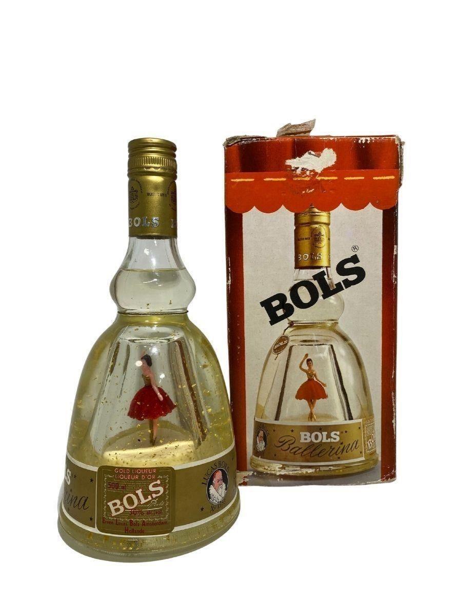 Bols Ballerina bottles were made between 1957 and 1978. They came filled with different kinds of liquor made by Lucas Bols, a Dutch distillery. Two versions were made, with the ballerina wearing either a red skirt or a white skirt. This is the Gold fleck version with the Red Skirt