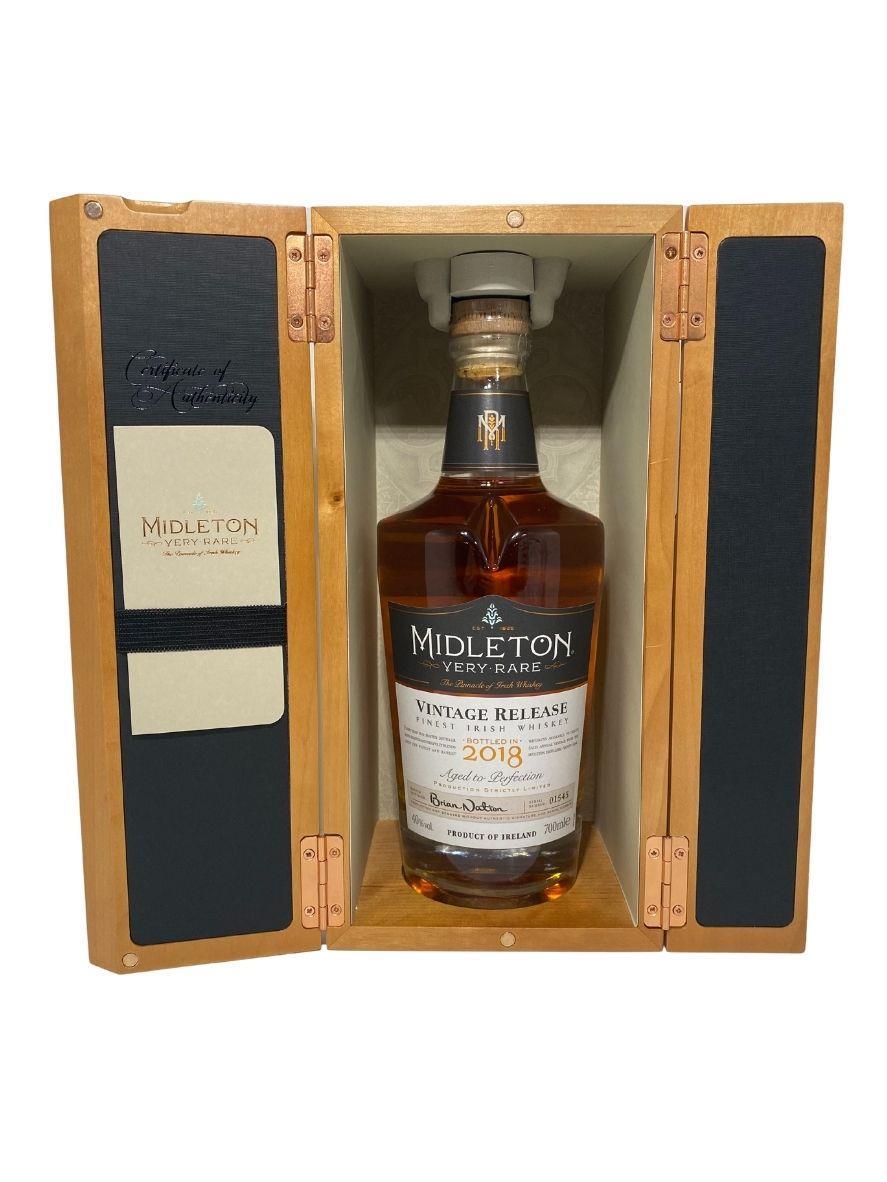 The Midleton Very Rare 2018, is a bottling brought out by the Midleton Distillery in Co. Cork. The ‘Midleton Very Rare’ range was launched in 1984 and a new vintage has been released every year since then. Barry Crockett started off the ‘Midleton Very Rare’ range while he was the Master Distiller of Midleton Distillery, in 2013 Barry Crockett retired from his role of Master Distiller. From 2014 onwards Brian Nation has been creating the ‘Midleton Very Rare’ range, maintaining its role as standard-bearer and pinnacle of Irish Whiskey. The bottle and gift box in great condition also include the cert and distillery invite. Bottle number 01545