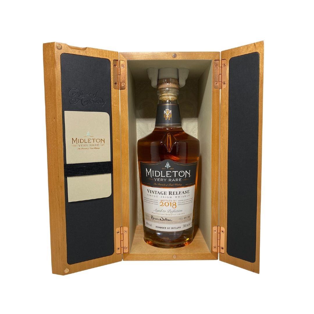 The Midleton Very Rare 2018, is a bottling brought out by the Midleton Distillery in Co. Cork. The ‘Midleton Very Rare’ range was launched in 1984 and a new vintage has been released every year since then. Barry Crockett started off the ‘Midleton Very Rare’ range while he was the Master Distiller of Midleton Distillery, in 2013 Barry Crockett retired from his role of Master Distiller. From 2014 onwards Brian Nation has been creating the ‘Midleton Very Rare’ range, maintaining its role as standard-bearer and pinnacle of Irish Whiskey. The bottle and gift box in great condition also include the cert and distillery invite. Bottle number 9186