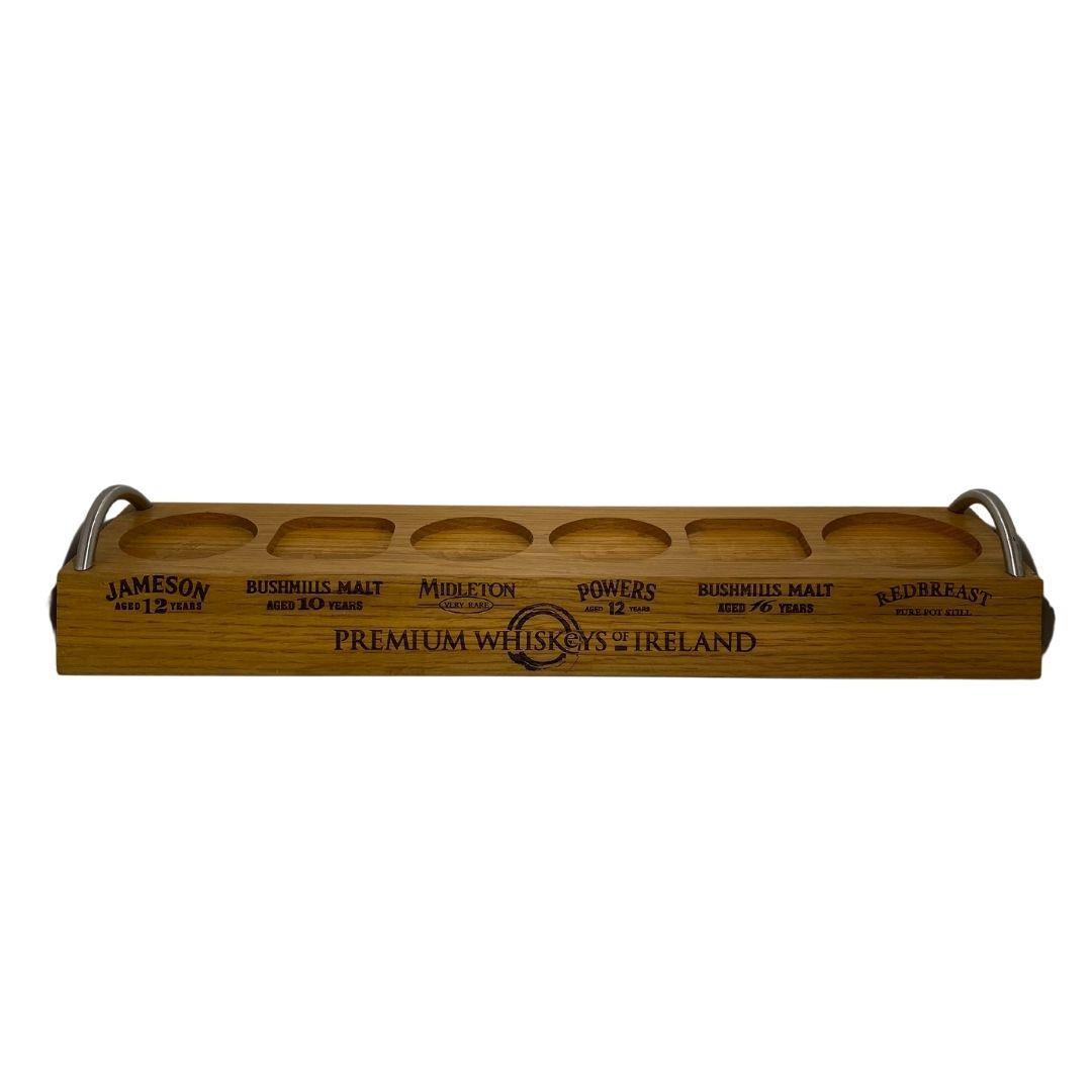 A wooden plinth for the 6 premium whiskeys of Ireland. Perfect for a home bar or a great showcase if you have the bottles mentioned on the plinth. Slight damage to one corner as seen in the photo.