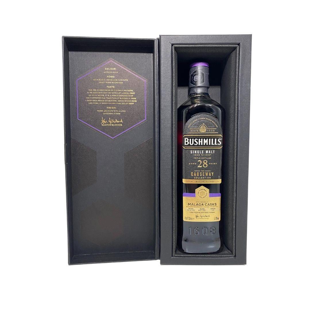 Bushmills 28 Year Old Single Malt Malaga Cask is the result of over 400 years of whiskey-making experience. This extremely rare, small quantity whiskey is rested in hand-selected ex-bourbon and Oloroso sherry barrels for 15 years, & finally finished in Malaga casks for 13 years.Unfortunately there are only 698 bottles of this avaiable.