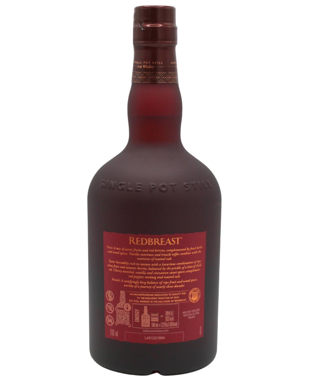 Master winner at the Irish Whiskey Masters in 2021, 2022, and 2023! This release is the oldest permanent member of the Redbreast range and one of their most award-winning. This expression has been matured in both bourbon and sherry casks as well as including ruby port casks for the first time to bring even more complexity and depth. Rich flavours of exotic fruits, wood spices and wonderful sweet treacle notes.