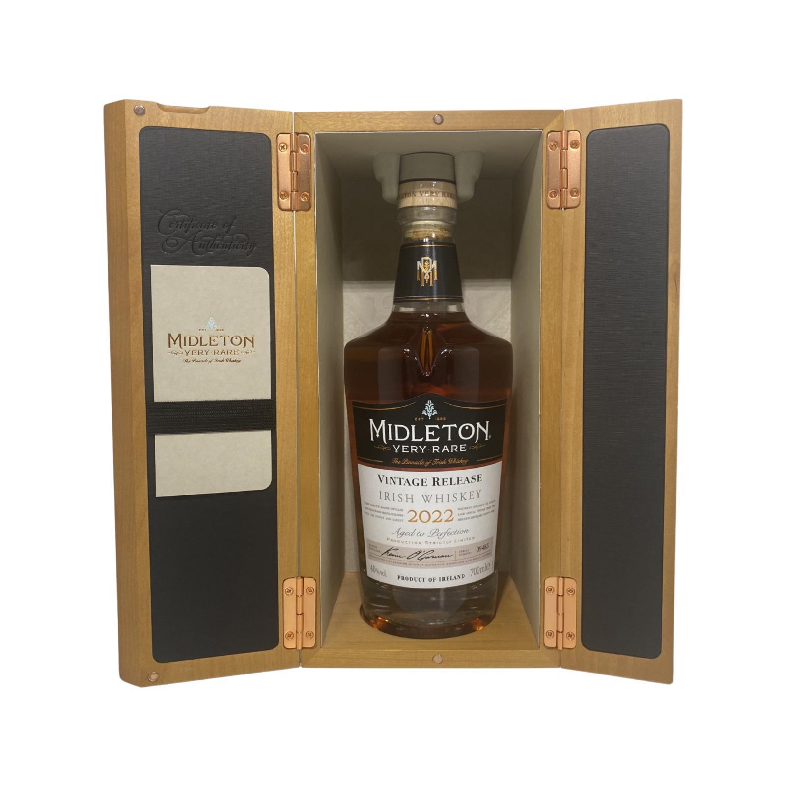 The 2022 edition to Ireland's most premium and beloved whiskey series; Midleton Very Rare. This is the 39th installment and the first release under Kevin O' Gorman appointed Master Distiller of the Midleton Distillery in 2020. Both the bottle and gift box are in very good condition, certificate and distillery invite are also included. Bottle number 30598