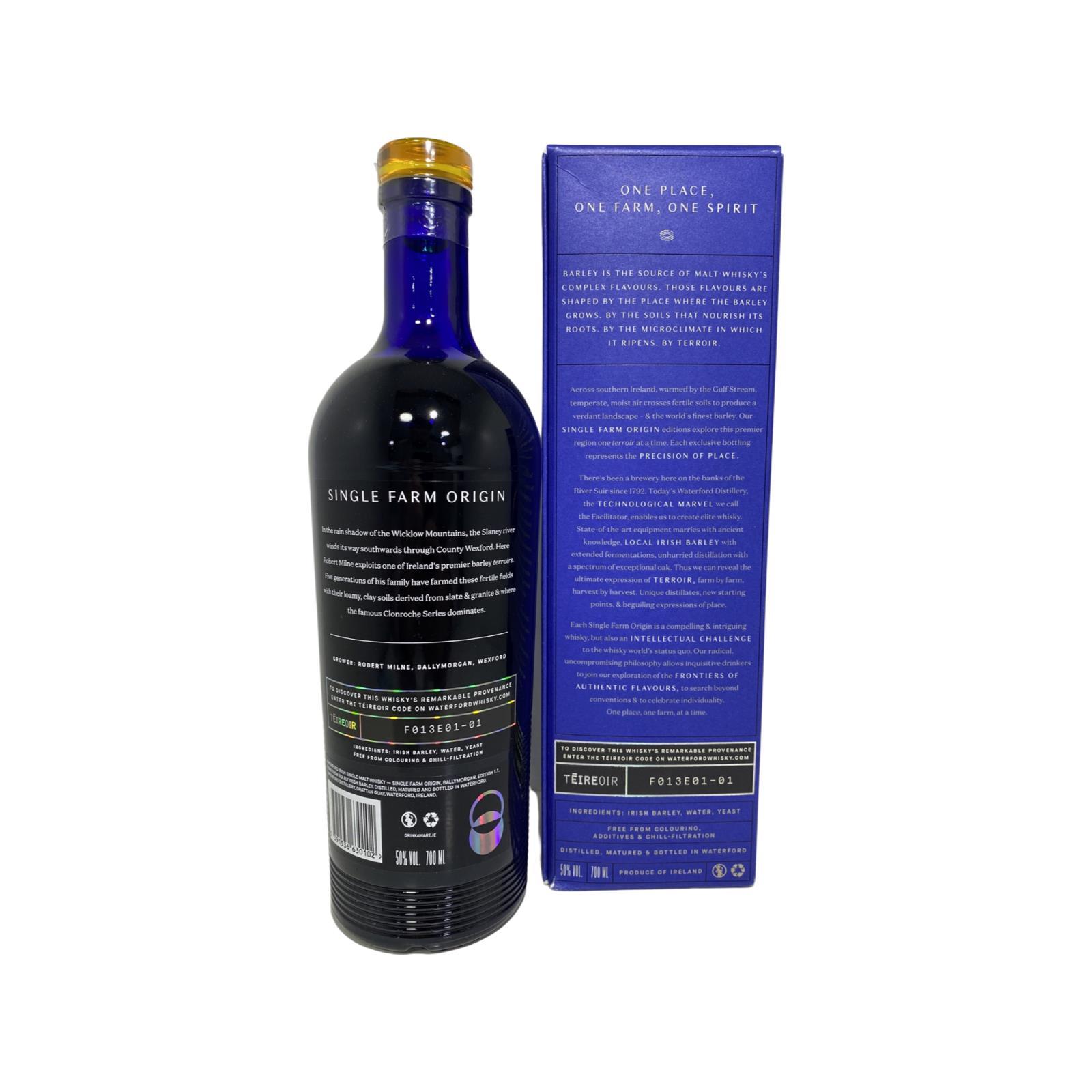Proudly utilising 100% demonstrably Irish-grown barley from one farm, one terroir, at a time, Waterford Ballymorgan makes use of barley grown by Robert Milne on one of Ireland’s premier malting barley terroirs - the famous Clonroche Series in Co. Wexford, with its loamy, clay soils derived from slate and granite. Limited Stock available.Bottled at 50% ABV without colouring, chill-filtration or any additives.