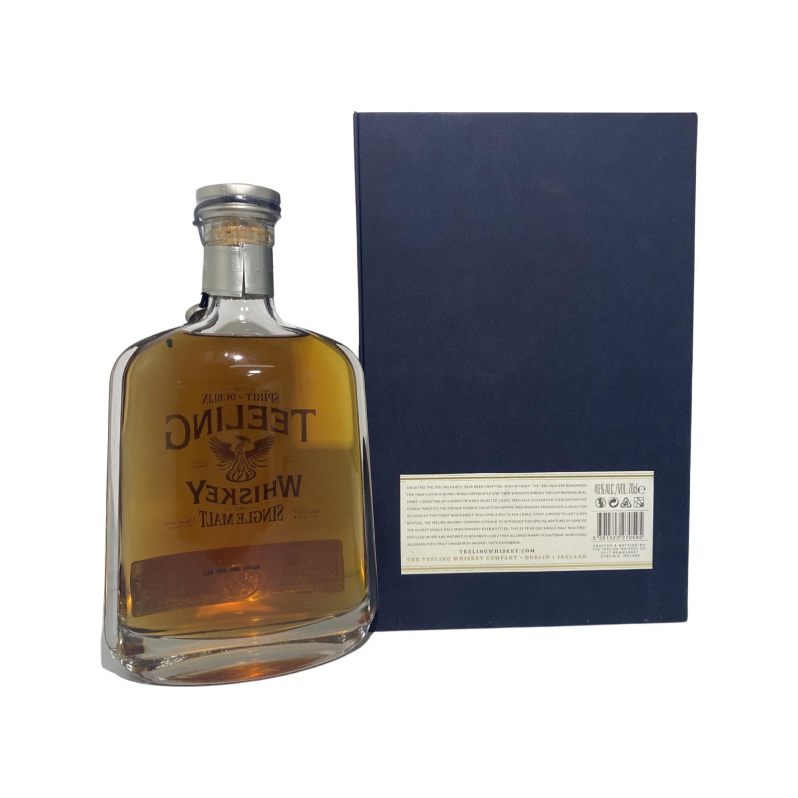 The Teeling 24 Year Old Single Malt Irish Whiskey was first distilled in 1991 and matured in Bourbon casks then allowed marry in Sauternes wine casks producing a wholly unique taste experience. The unique dual maturation imparts an extra depth of fruit flavours that perfectly complement the hint of smoke derived from the inclusion of a small portion of Peated malt as part of the original ingredients used in production. This small batch bottling, limited to just 5,000 70cl bottles, were hand bottled in unique decanter bottles and come with their own certificate of authenticity. This was awarded the title of World’s Best Irish Single Malt, this is a whiskey to be savoured.