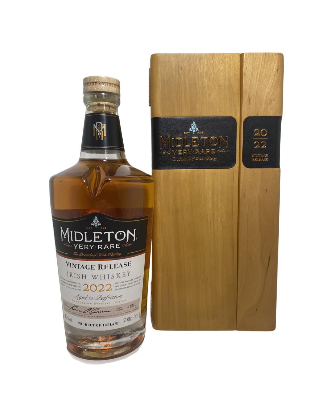 The 2022 edition to Ireland's most premium and beloved whiskey series; Midleton Very Rare. This is the 39th installment and the first release under Kevin O' Gorman appointed Master Distiller of the Midleton Distillery in 2020. Both the bottle and gift box are in very good condition, certificate and distillery invite are also included. Bottle number 41225