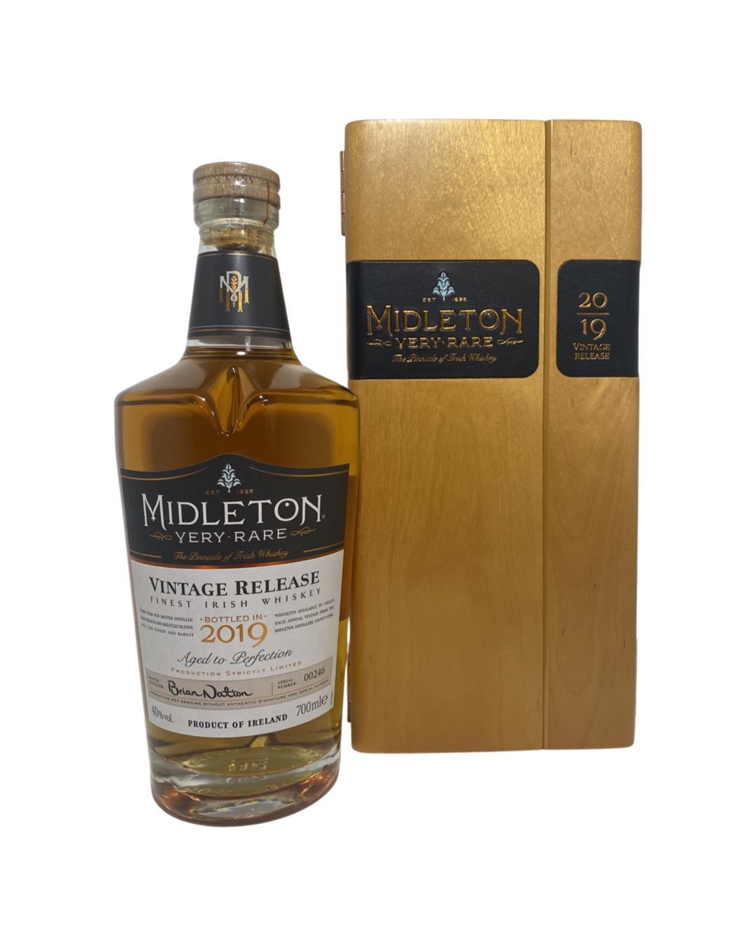 The Midleton Very Rare 2019 is part of the Midleton Very Rare collection that began in 1984 whereby a new vintage is released every year. The bottle and box are in very good condition, the certificate and distillery invite are both included. Bottle Number 00246