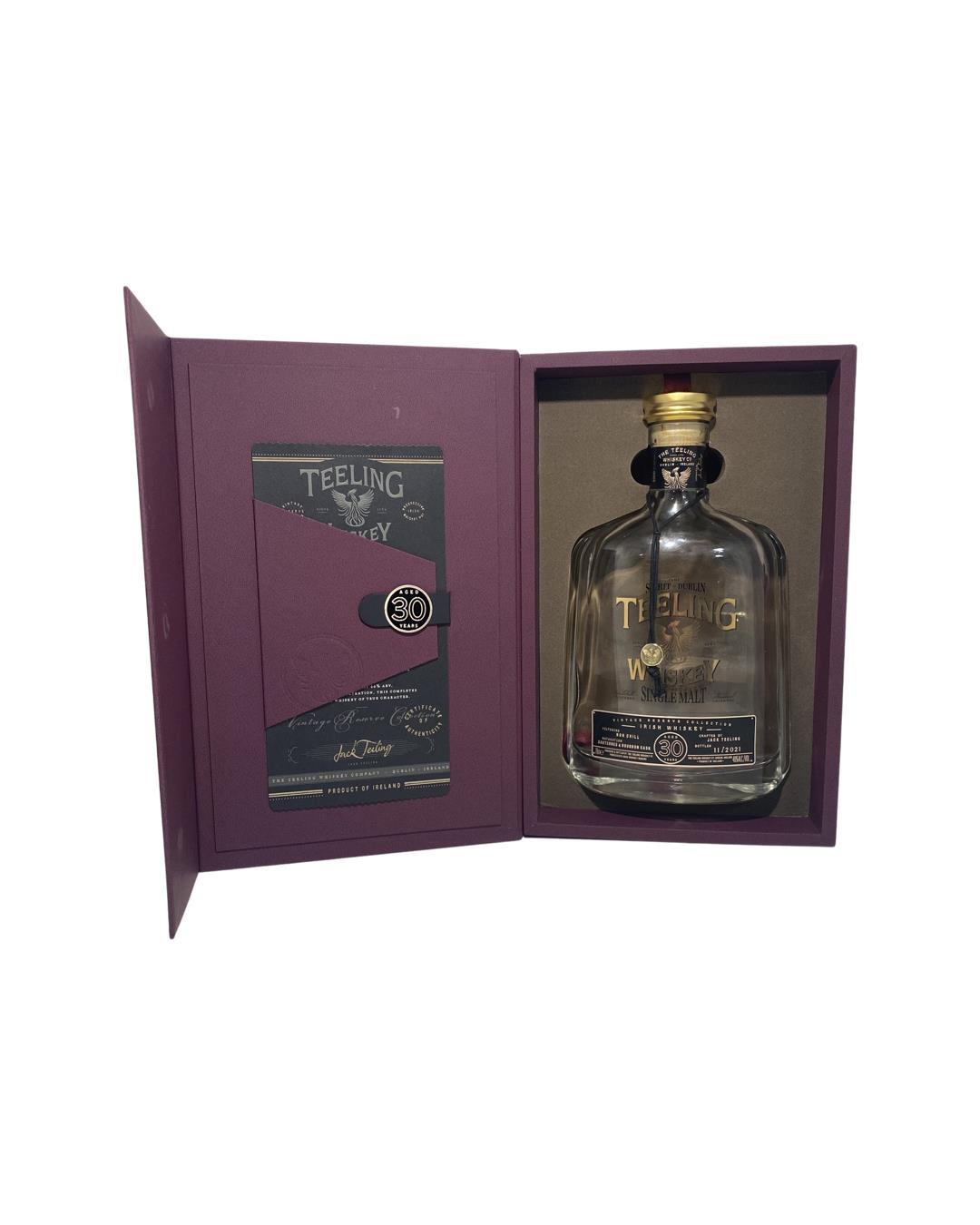An empty bottle of teeling 30 year old with the box. Perfect for bar décor or perhaps turning into a lamp or clock. The possibilities are endless.