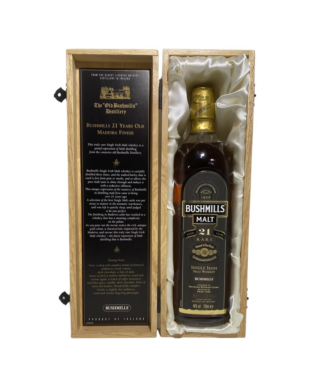 The 21-year-old Bushmills is the oldest whiskey in the standard distillery range. It is a remarkably fresh and lively tasting malt, given its advanced years. Like the rest of the single malts from Bushmills, this is initially aged in both bourbon and sherry casks. These are then vatted together and married into madeira wine casks for two years. We would go as far to say that this is, thankfully, quite a subtle wood finish. The Bushmills malt is very delicate and elegant and this strikes a nice balance of fruit, spice and sweetness.