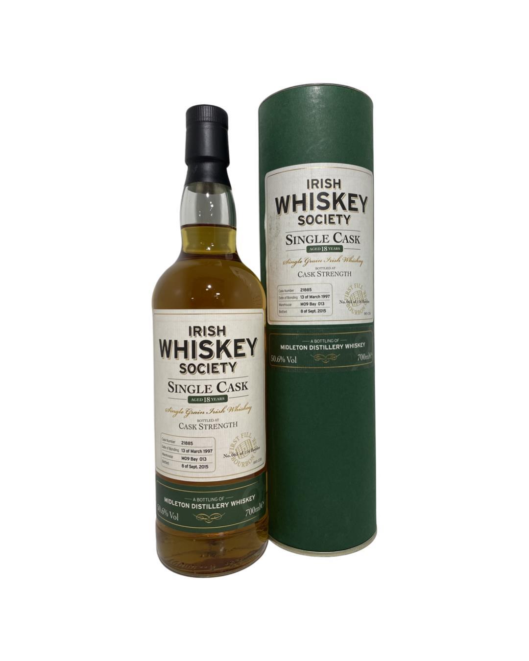 An Exclusive Single Cask of Midleton 18 Year old Single Grain Irish whiskey bottled for The Irish Whiskey Society.Only 114 bottles were produced which makes this a proper rare bottling. Distilled in March 1997 and Bottled in 2015. Cask No. 21885.
