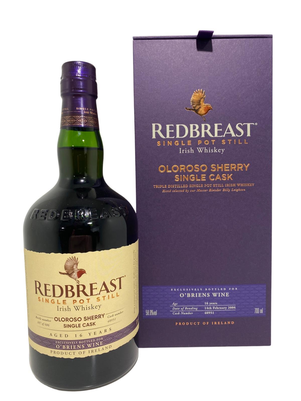 When it comes to Single Casks its hard to beat Redbreast All Sherry. This is the new LIMITED EDITION Single Cask from Redbreast whiskey, hand selected and bottled exclusively for O briens wine. This single pot still is tripled distilled and entirely matured for 16 years in Oloroso Sherry Casks. Bottled at 58.9%, single cask 40951 is limited to just 606 bottles.