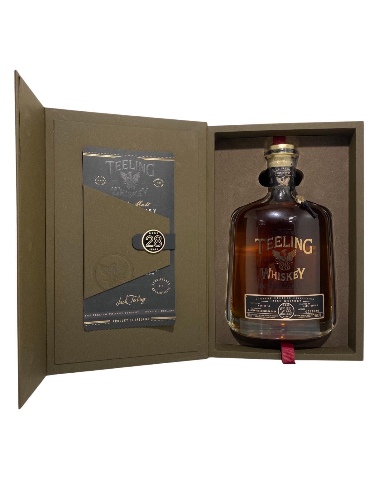 Building on the international success of the Teeling 21 and Teeling 24 Year Old single malts, Teeling now present their latest release; Teeling 28 Year Old Single Malt. This whiskey consists of the same liquid as the World's Best Single Malt winning 24 Year Old single malt, aged for a further four years. This is a very limited release of vintage single malt whiskey, celebrating the very best that Teeling has to offer. Initially aged in ex- Bourbon casks and finished in Sauternes, this special whiskey is limited to just 4,000 bottles.