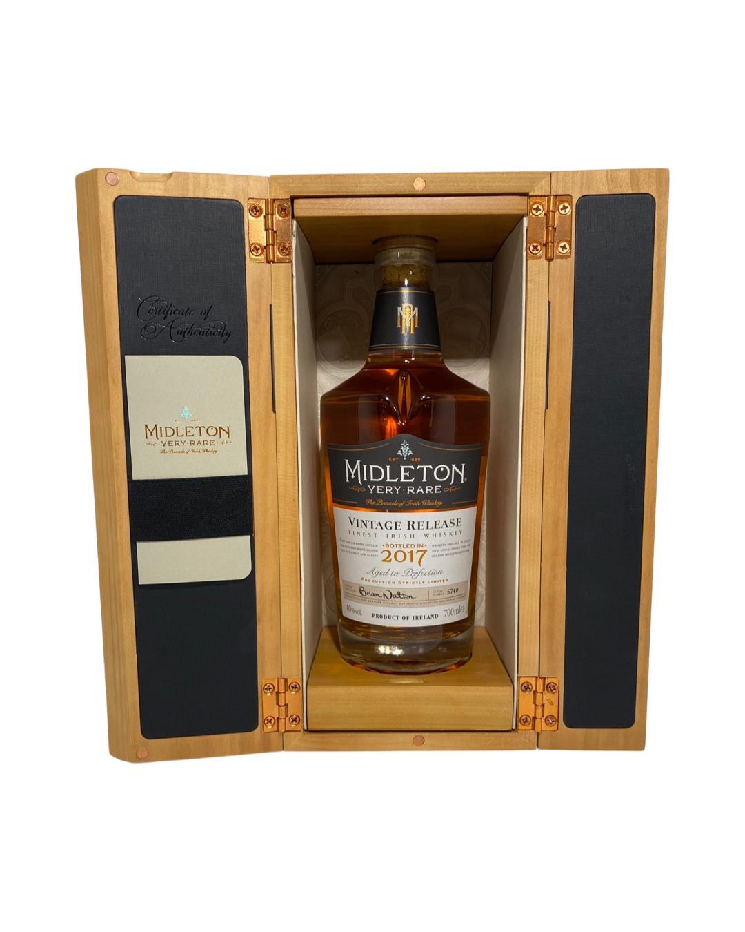 The Midleton Very Rare 2017, is a bottling brought out by the Midleton Distillery in Co. Cork. The ‘Midleton Very Rare’ range was launched in 1984 and a new vintage has been released every year since then. Barry Crockett started off the ‘Midleton Very Rare’ range while he was the Master Distiller of Midleton Distillery, in 2013 Barry Crockett retired from his role of Master Distiller. From 2014 onwards Brian Nation has been creating the ‘Midleton Very Rare’ range, maintaining its role as standard-bearer and pinnacle of Irish Whiskey. The bottle and gift box in great condition also include the cert and distillery invite.