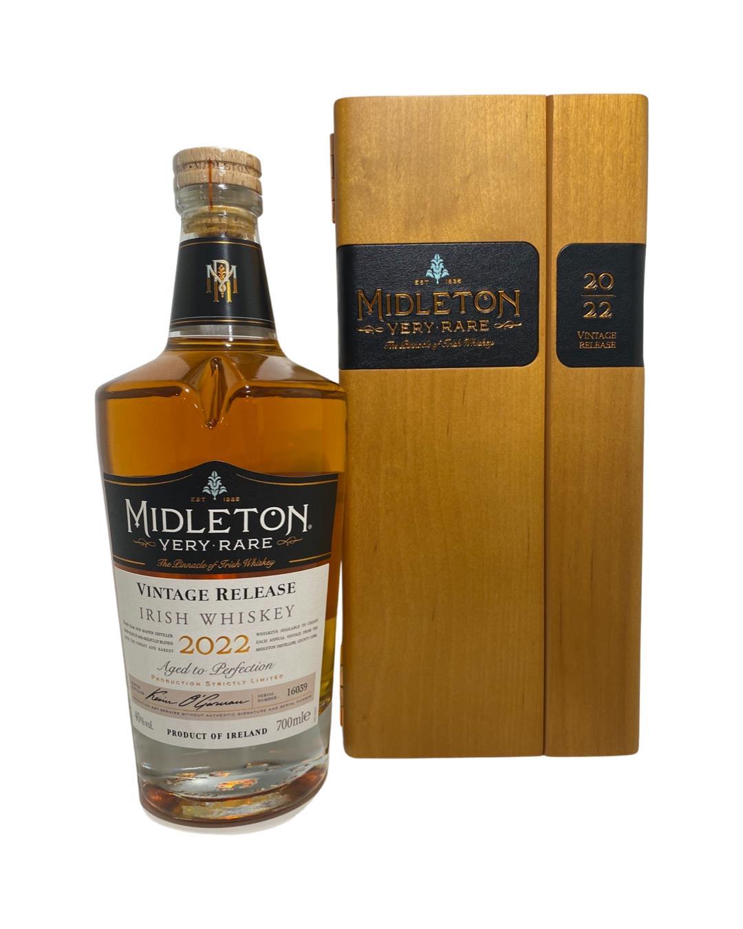 The 2022 edition to Ireland's most premium and beloved whiskey series; Midleton Very Rare. This is the 39th installment and the first release under Kevin O' Gorman appointed Master Distiller of the Midleton Distillery in 2020. Both the bottle and gift box are in very good condition, certificate and distillery invite are also included. The Midleton Very Rare range of whiskeys is a collection of highly regarded Irish whiskeys crafted at the Midleton Distillery in County Cork, Ireland. With a reputation for excellence, these whiskeys are known for their exceptional quality, craftsmanship, and limited availability.