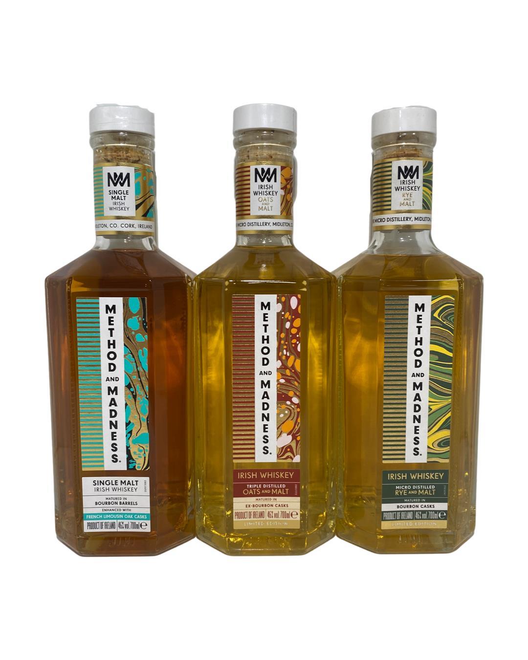 A trio of whiskey from the innovative Method and Madness.This showcases the innovation The Method & Madness Rye and Malt is an innovative mash bill of 60% Rye to 40% Malted Barley. This whiskey is double distilled and bottled at 46%. Following from the success of 2021's Rye and Malt, this expression is made from a mash bill of 60% oats and 40% malted barley and then matured in bourbon barrels. Fantastic toasted marshmallows on the nose, followed by flavours of fudge and citrus with a gentle finish with a hint of soft oats.Single Malt Irish Whiskey Enhanced With French Limousin Oak, has been initially matured in ex-Bourbon barrels, imparting flavours of “malt and biscuit”, and in a first for the category, has been part-finished in French Limousin oak for one year to add a “lighter, floral and herbal note”.