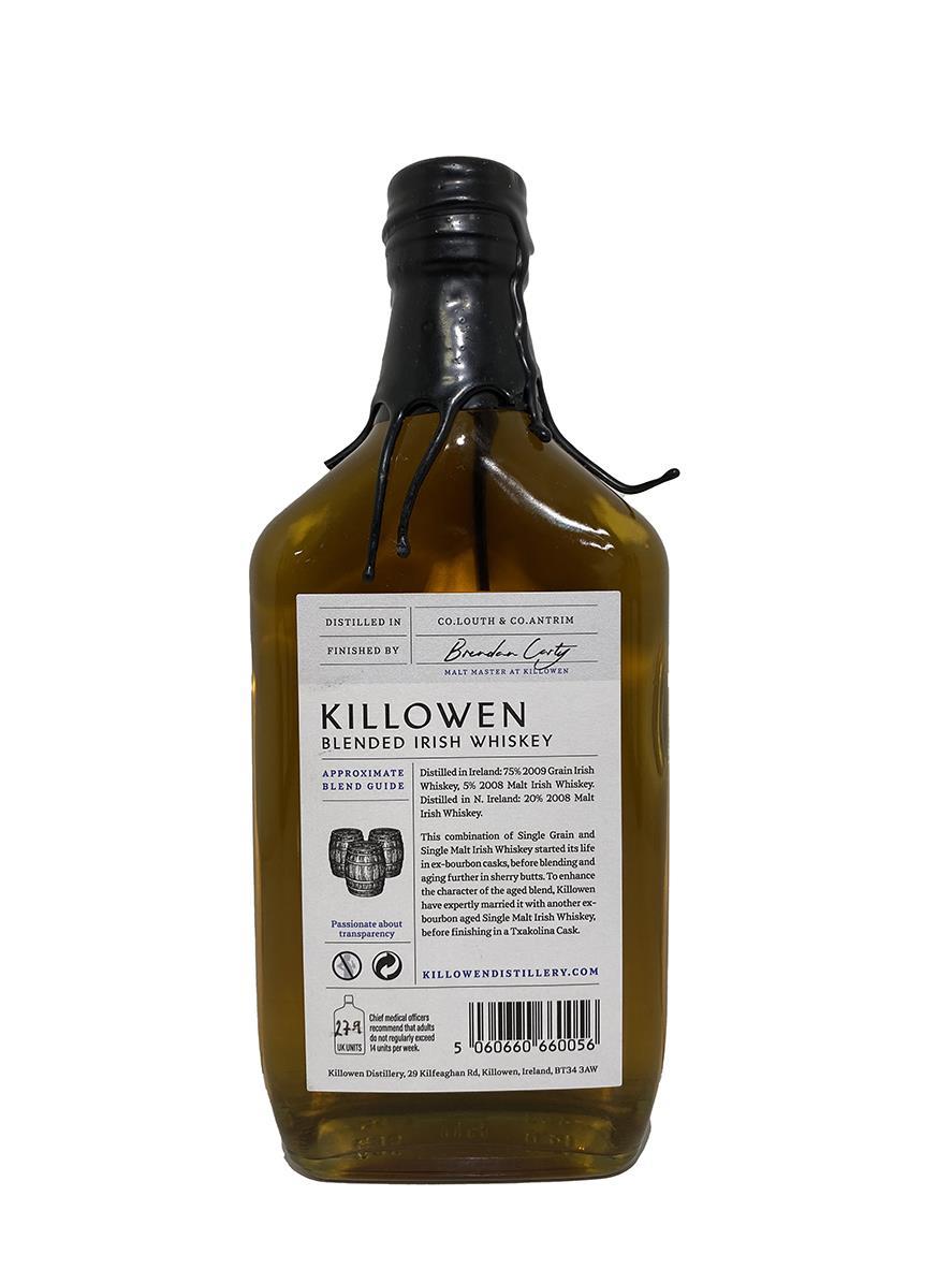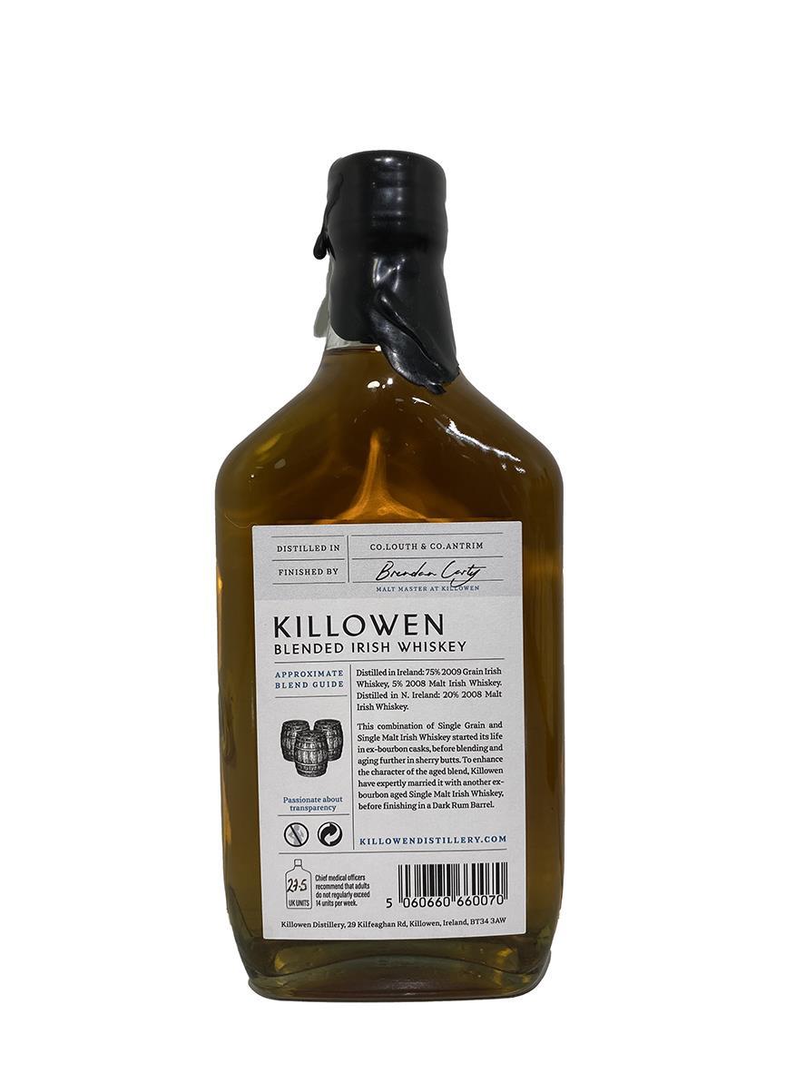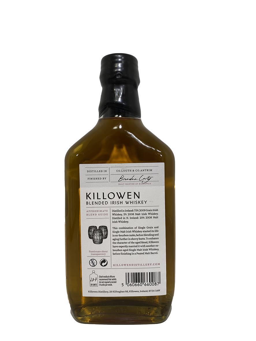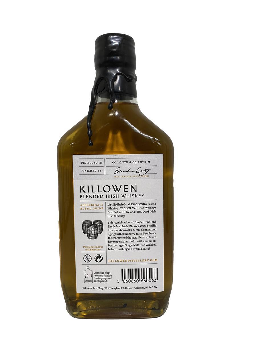 The single grain and single malt whiskies are initially matured in ex-bourbon barrels before being blended together and then spending some time in sherry casks. Then this is married with another ex-bourbon single malt before a final finish in the wood of Brendan’s choice.Killowen has used ex-Dark Rum, ex-Txakolina wine, ex-Tequila cask, an ex-Islay cask and ex-Pinot Noir with a Stout Cask finish and a Virgin Hungarian oak cask to round out the series.