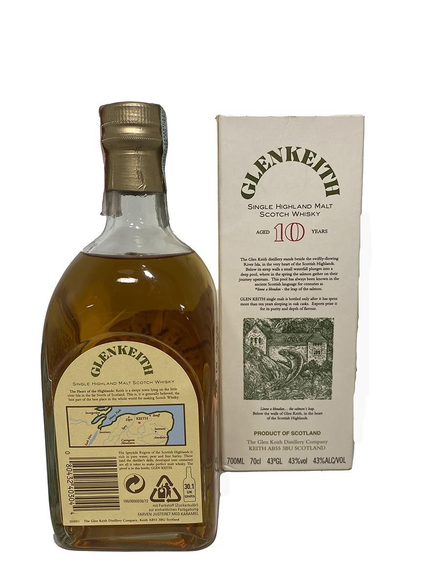 Discontinued bottling of Glen Keith 10-year-old single malt scotch whisky from before being mothballed in 1999. Refurbished in 2012 and production resumed in 2013.