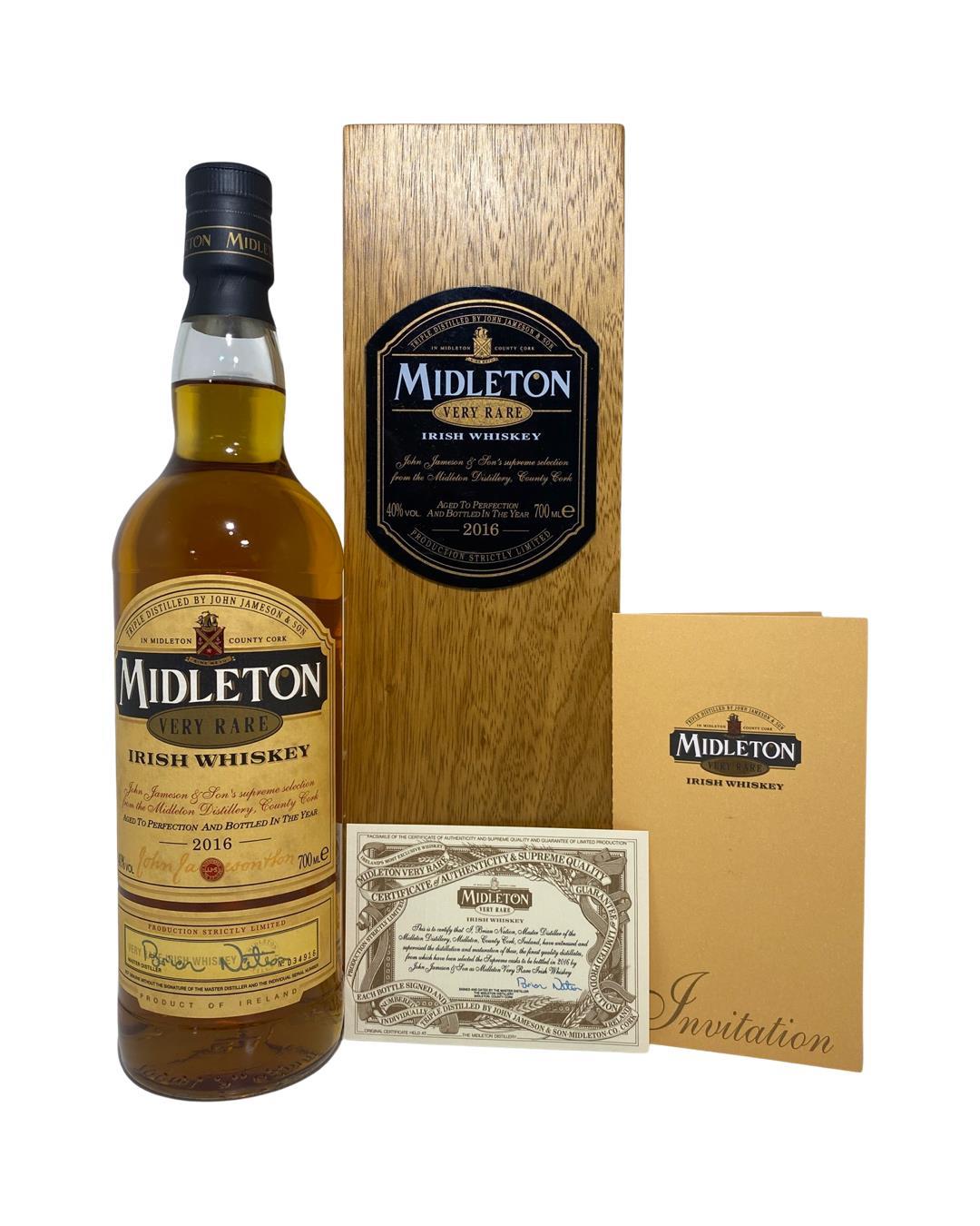 The Midleton Very Rare 2016, is a bottling brought out by the Midleton Distillery in Co. Cork. The ‘Midleton Very Rare’ range was launched in 1984 and a new vintage has been released every year since then. Barry Crockett started off the ‘Midleton Very Rare’ range while he was the Master Distiller of Midleton Distillery, The bottle and box are in excellent condition and include the distillery invite and certificate.