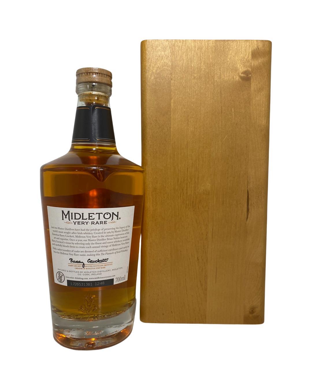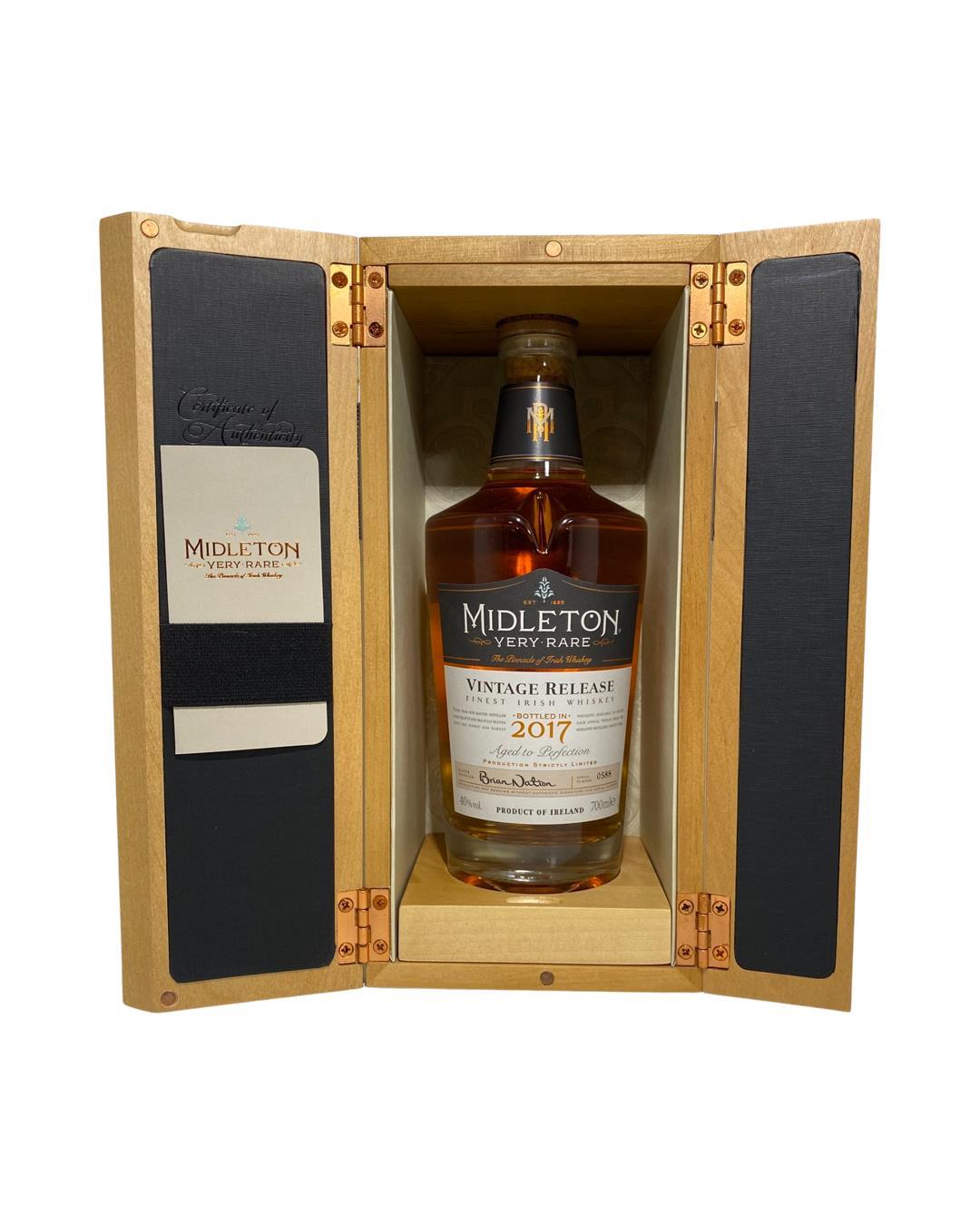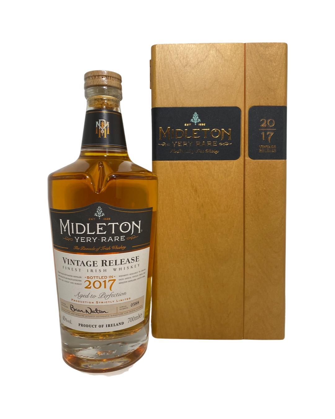 The Midleton Very Rare 2017, is a bottling brought out by the Midleton Distillery in Co. Cork. The ‘Midleton Very Rare’ range was launched in 1984 and a new vintage has been released every year since then. Barry Crockett started off the ‘Midleton Very Rare’ range while he was the Master Distiller of Midleton Distillery, in 2013 Barry Crockett retired from his role of Master Distiller. From 2014 onwards Brian Nation has been creating the ‘Midleton Very Rare’ range, maintaining its role as standard-bearer and pinnacle of Irish Whiskey. The bottle and gift box in great condition also include the cert and distillery invite. Old bottle style and label.The Midleton Very Rare range of whiskeys is a collection of highly regarded Irish whiskeys crafted at the Midleton Distillery in County Cork, Ireland. With a reputation for excellence, these whiskeys are known for their exceptional quality, craftsmanship, and limited availability. Characterized by smoothness, complexity, and depth of flavour, Midleton Very Rare often exhibits notes of ripe fruits, honey, vanilla, spices, and oak. The component casks are typically aged for around 12-27 years but each yearly batch is unique and for this reason the whiskeys are highly collectible. To this day the Midleton Very Rare series is still regarded as the pinnacle and benchmark for ultra-premium blended Irish whiskeys.