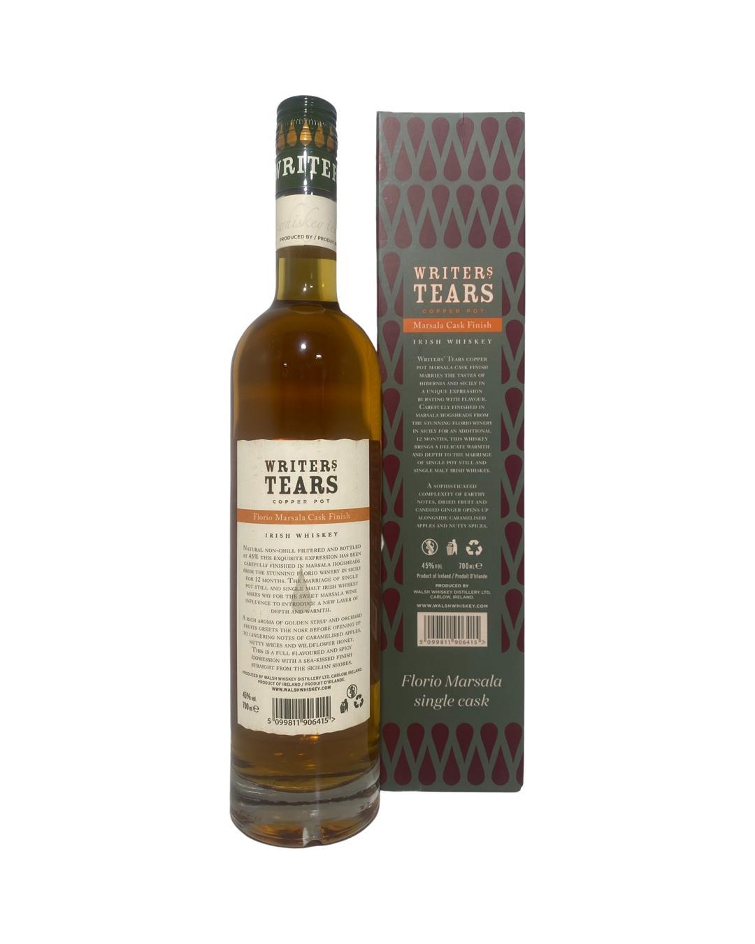 The Writers' Tears Copper Pot Florio Marsala Cask Finish. This whiskey was originally matured in American Ex-Bourbon casks before being finished for twelve months in Marsala casks from the Florio Winery in Sicily. Flavours of caramalised apples, toffee and a little spice!