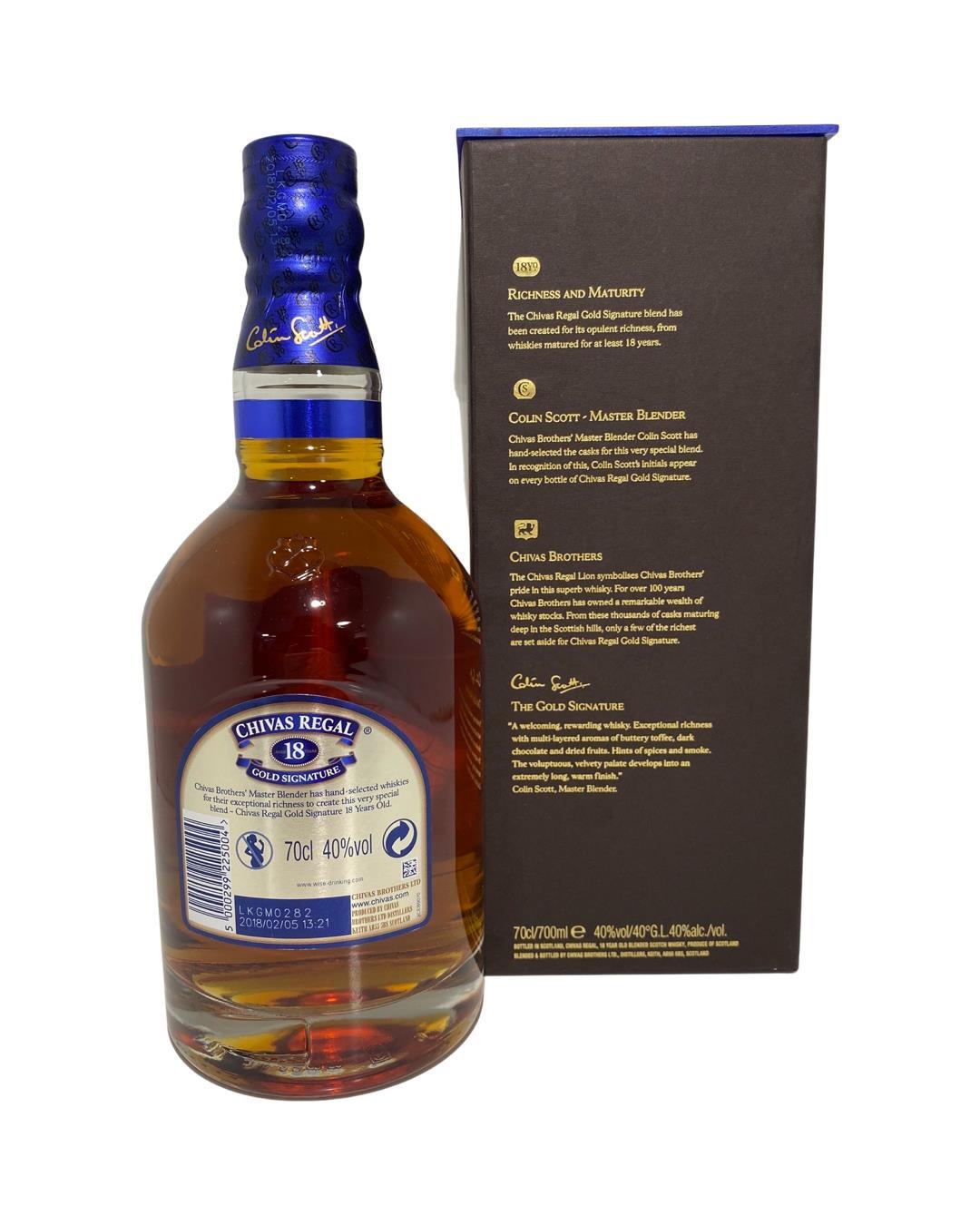 Chivas 18 Year Old is an award-winning blended scotch whisky. Chivas 18 Year Old is a uniquely rich and multi-layered blend that includes over twenty of Scotland's rarest single malt Scotch whiskies. If you know Chivas Regal 18, you'll know some things can't be simplified. You'll know the refined and complex blend of 85 flavour notes in every measure of whisky is 18 years in the making. Velvety, luxurious, dark chocolate cues and multi-layered aromas of dried fruit and buttery toffee
