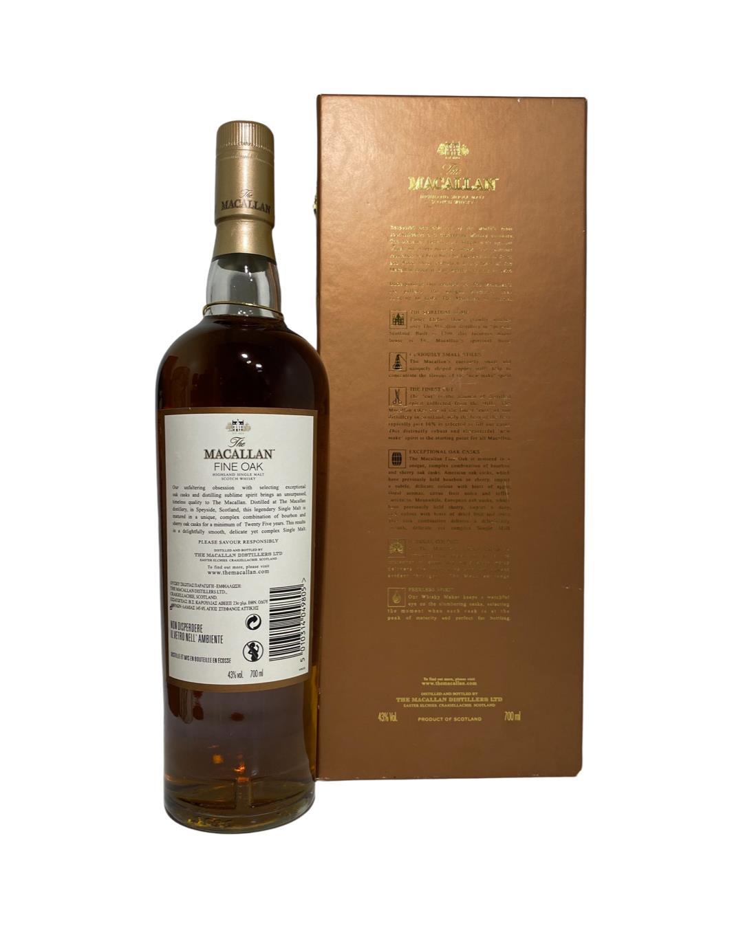 The complex range of casks that are selected by Macallan for their Fine Oak Range is exemplified here in the 25 year old expression. Its lighter hue belies the bursts of vanilla, peaches and dried fruit on the palate. The Macallan Distillery, located in Craigellachie, Scotland, is renowned for its exceptional single malt Scotch whiskies with a strong tradition of maturation in quality Sherry casks. A rich history dating back to 1824, Macallan has established itself as a symbol of luxury and craftsmanship. Nestled within the beautiful Speyside region, the distillery's stunning architectural design seamlessly blends with the surrounding landscape. Its unique production process combines traditional methods with cutting-edge technology, resulting in whiskies of unparalleled quality. ‘The Macallan’ stands as a symbol of excellence in the whisky world. Its whiskies are known for their complexity, craftsmanship, and attention to detail. From their core expressions to exclusive releases, Macallan continues to captivate whisky connoisseurs and collectors with its exceptional range of single malt Scotch whiskies.