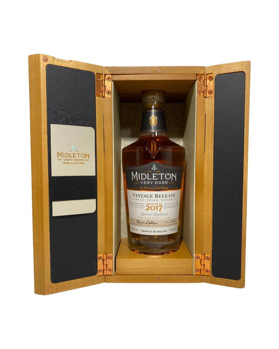 The Midleton Very Rare 2017, is a bottling brought out by the Midleton Distillery in Co. Cork. The ‘Midleton Very Rare’ range was launched in 1984 and a new vintage has been released every year since then. Barry Crockett started off the ‘Midleton Very Rare’ range while he was the Master Distiller of Midleton Distillery, in 2013 Barry Crockett retired from his role of Master Distiller. From 2014 onwards Brian Nation has been creating the ‘Midleton Very Rare’ range, maintaining its role as standard-bearer and pinnacle of Irish Whiskey. The bottle and gift box in great condition also include the cert and distillery invite. Old bottle style and label.The Midleton Very Rare range of whiskeys is a collection of highly regarded Irish whiskeys crafted at the Midleton Distillery in County Cork, Ireland. With a reputation for excellence, these whiskeys are known for their exceptional quality, craftsmanship, and limited availability. Characterized by smoothness, complexity, and depth of flavour, Midleton Very Rare often exhibits notes of ripe fruits, honey, vanilla, spices, and oak. The component casks are typically aged for around 12-27 years but each yearly batch is unique and for this reason the whiskeys are highly collectible. To this day the Midleton Very Rare series is still regarded as the pinnacle and benchmark for ultra-premium blended Irish whiskeys.