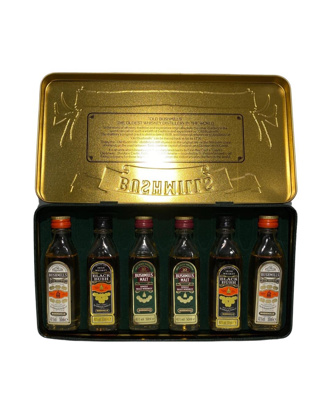 The Bushmills Miniature Collection contains six miniature bottles of Irish whiskey from the Oldest Whiskey Distillery in the World. These are presumed from the 80s. The fill level in each bottle is slightly different but all lower than it should be due to evaporation over the years. 2 x Bushmills White Label, 5cl, 40% ABV 2 x Bushmills Black Bush, 5cl, 40% ABV 2 x Bushmills Malt 10-Year-Old, 5cl, 40% ABV