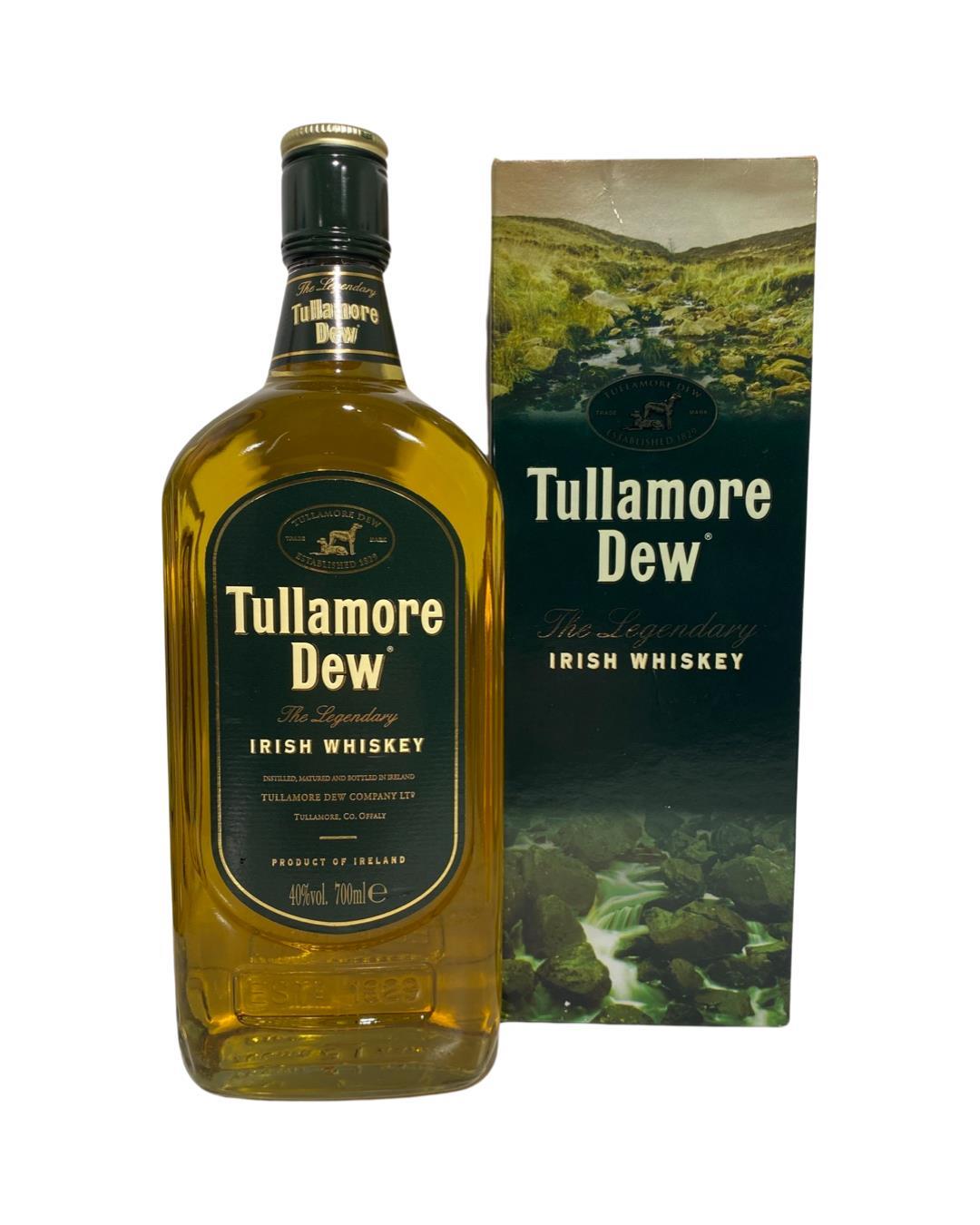 This is an old style bottle of Tullamore dew thought to be from the 90s. This is the original blend old labeling. Tullamore Dew is a smooth, mellow whiskey that is a blend of Pot Still and Grain Whiskeys which are presently distilled in Midleton Distillery in County Cork. On the nose, a mild blend of spicy, lemony and malty notes, with charred wood and vanilla undertones. Light bodied, sweetish spices, buttery and rounded with light citrus fruitiness.