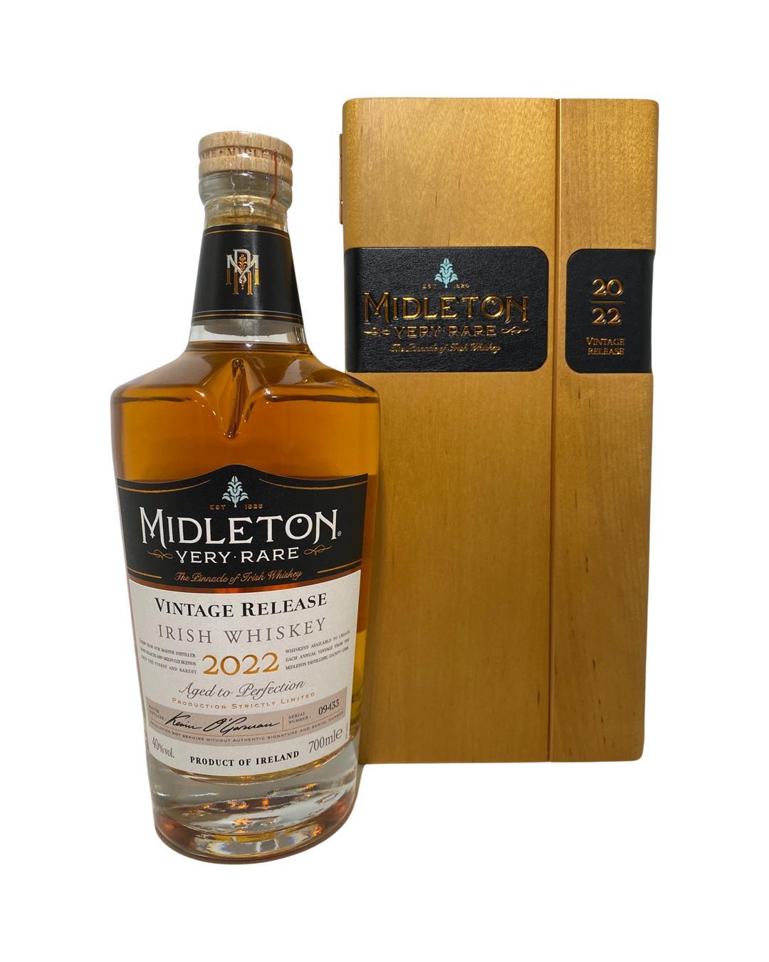 The 2022 edition to Ireland's most premium and beloved whiskey series; Midleton Very Rare. This is the 39th installment and the first release under Kevin O' Gorman appointed Master Distiller of the Midleton Distillery in 2020. Both the bottle and gift box are in very good condition, certificate and distillery invite are also included. The Midleton Very Rare range of whiskeys is a collection of highly regarded Irish whiskeys crafted at the Midleton Distillery in County Cork, Ireland. With a reputation for excellence, these whiskeys are known for their exceptional quality, craftsmanship, and limited availability. Characterized by smoothness, complexity, and depth of flavour, Midleton Very Rare often exhibits notes of ripe fruits, honey, vanilla, spices, and oak. The component casks are typically aged for around 12-27 years but each yearly batch is unique and for this reason the whiskeys are highly collectible. To this day the Midleton Very Rare series is still regarded as the pinnacle and benchmark for ultra-premium blended Irish whiskeys.