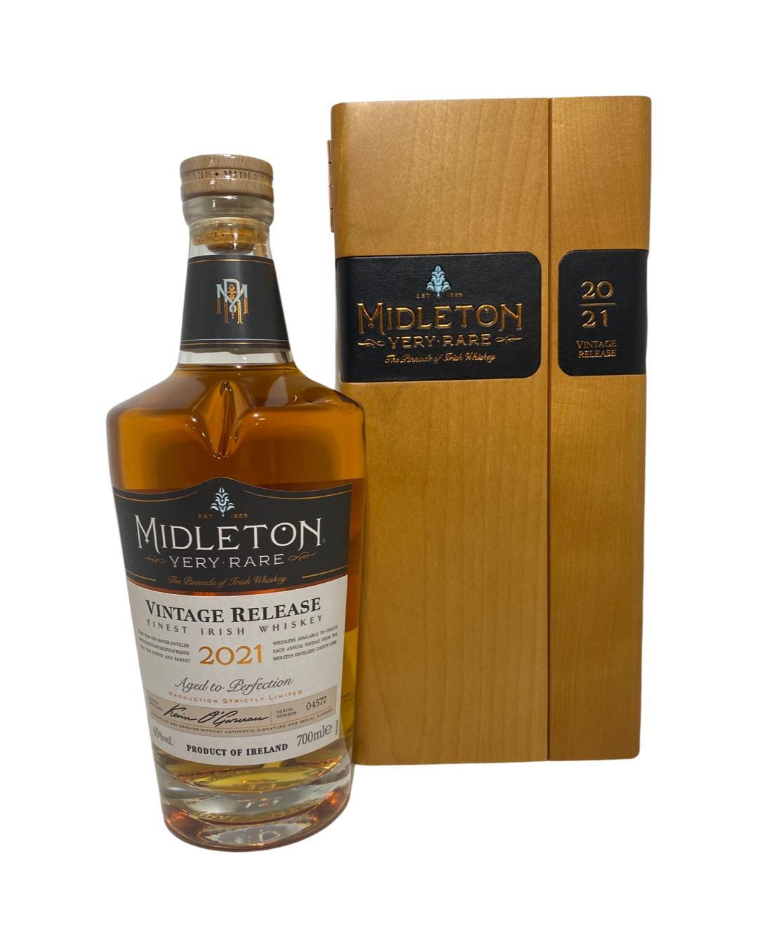 The 2021 edition to Ireland's most premium and beloved whiskey series; Midleton Very Rare. This is the 38th installment and the first release under Kevin O' Gorman appointed Master Distiller of the Midleton Distillery in 2020. Both the bottle and gift box are in very good condition, certificate and distillery invite are also included. The Midleton Very Rare range of whiskeys is a collection of highly regarded Irish whiskeys crafted at the Midleton Distillery in County Cork, Ireland. With a reputation for excellence, these whiskeys are known for their exceptional quality, craftsmanship, and limited availability. Characterized by smoothness, complexity, and depth of flavour, Midleton Very Rare often exhibits notes of ripe fruits, honey, vanilla, spices, and oak. The component casks are typically aged for around 12-27 years but each yearly batch is unique and for this reason the whiskeys are highly collectible. To this day the Midleton Very Rare series is still regarded as the pinnacle and benchmark for ultra-premium blended Irish whiskeys.
