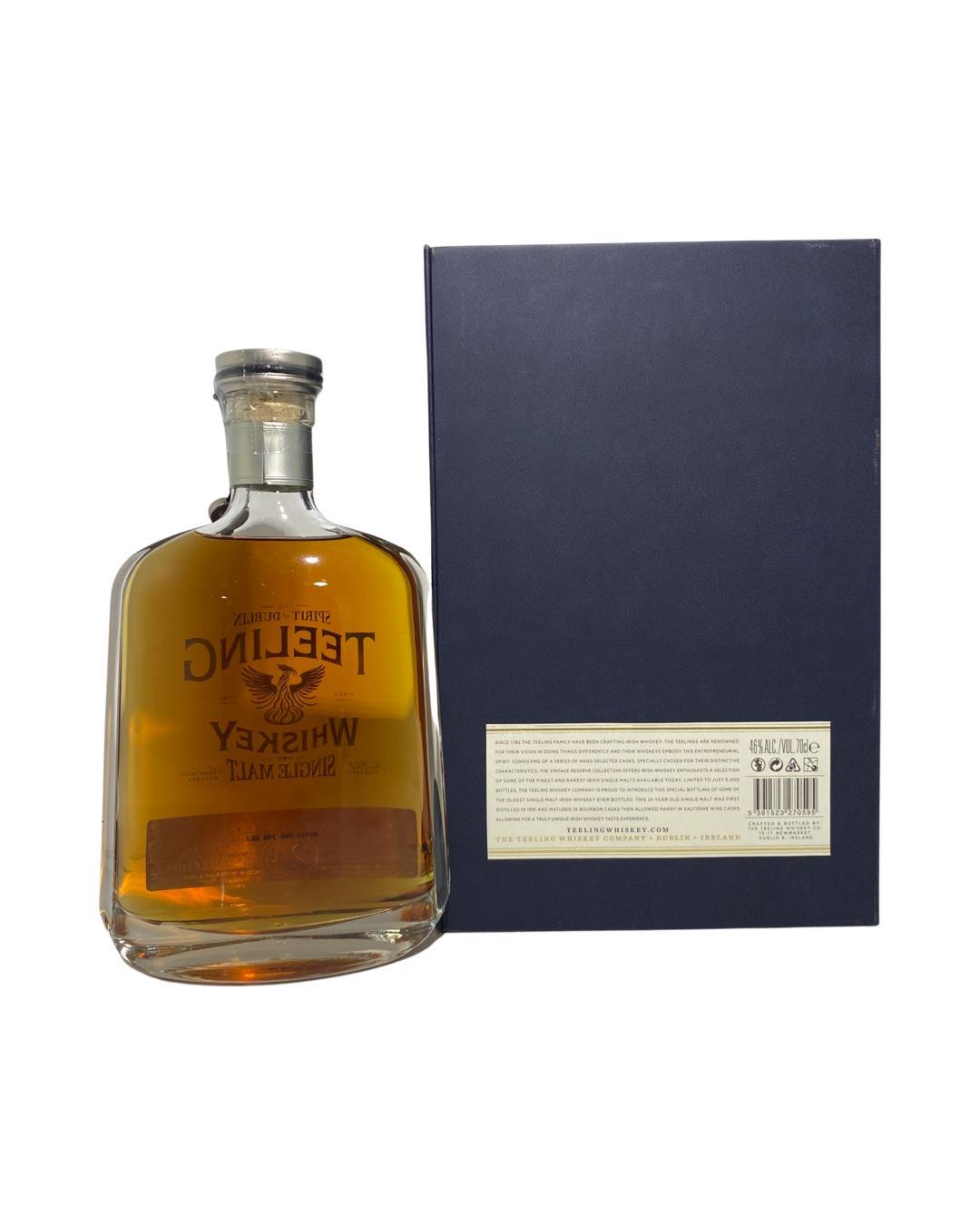 The Teeling 24 Year Old Single Malt Irish Whiskey was first distilled in 1991 and matured in Bourbon casks then allowed marry in Sauternes wine casks producing a wholly unique taste experience. The unique dual maturation imparts an extra depth of fruit flavours that perfectly complement the hint of smoke derived from the inclusion of a small portion of Peated malt as part of the original ingredients used in production. This small batch bottling, limited to just 5,000 70cl bottles, were hand bottled in unique decanter bottles and come with their own certificate of authenticity. This was awarded the title of World’s Best Irish Single Malt, this is a whiskey to be savoured. Teeling Whiskey and the Teeling Distillery are integral parts of Ireland's whiskey renaissance. Founded by the Teeling family in 2012, the distillery is located in the heart of Dublin, the first new distillery in the city in over 125 years. Teeling Whiskey stands out for its innovative approach to Irish whiskey production. The distillery prides itself on handcrafted, small-batch spirits that combine traditional methods with a contemporary twist. They focus on utilizing a diverse range of cask types for maturation, resulting in whiskies with unique and complex flavour profiles. In addition to their core range, Teeling offers limited edition releases and single malt expressions that further showcase their commitment to quality and experimentation. Of course, most of their older expressions are bottled from mature stock from other distilleries (such as Bushmills and Cooley), but we are also starting to see excellent releases from the Dublin distilled inventory.