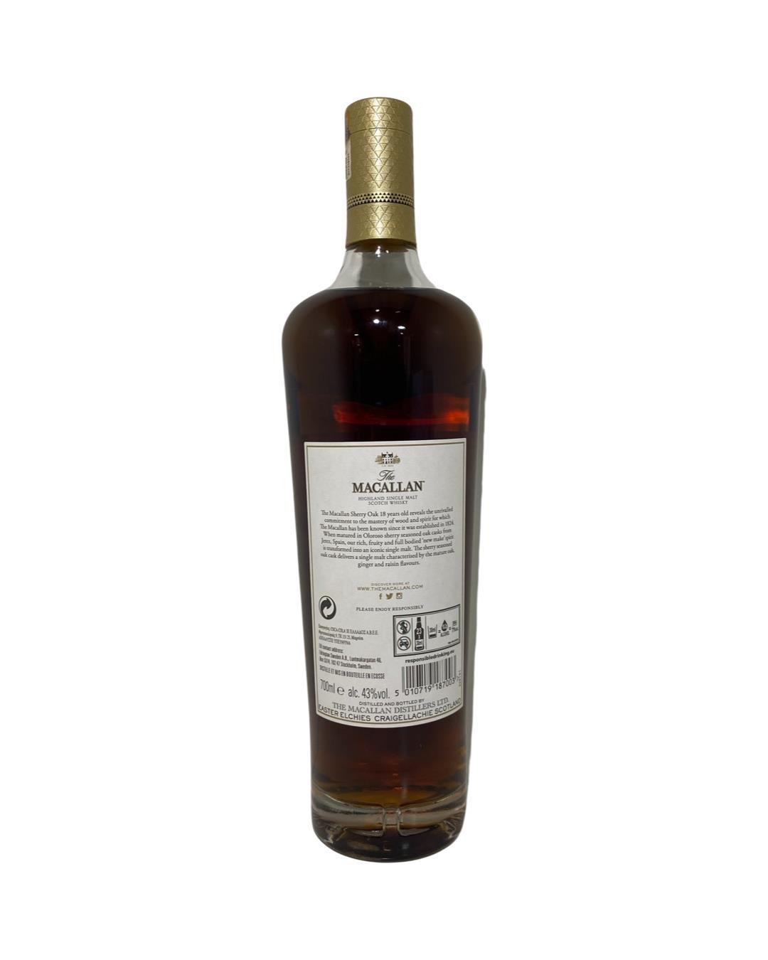 This Macallan 18 Year Old Sherry Oak 2021 Release is a part of the Sherry Oak collection which focuses exclusively on Single Malts aged in rich sherry casks. These hand-selected seasoned oak casks are chosen from the Jerez region for the complexity and warmth that they add to the liquid. This is a full-bodied single malt, spicy and warm on the nose with citrus and ginger on the finish. Not to be missed!