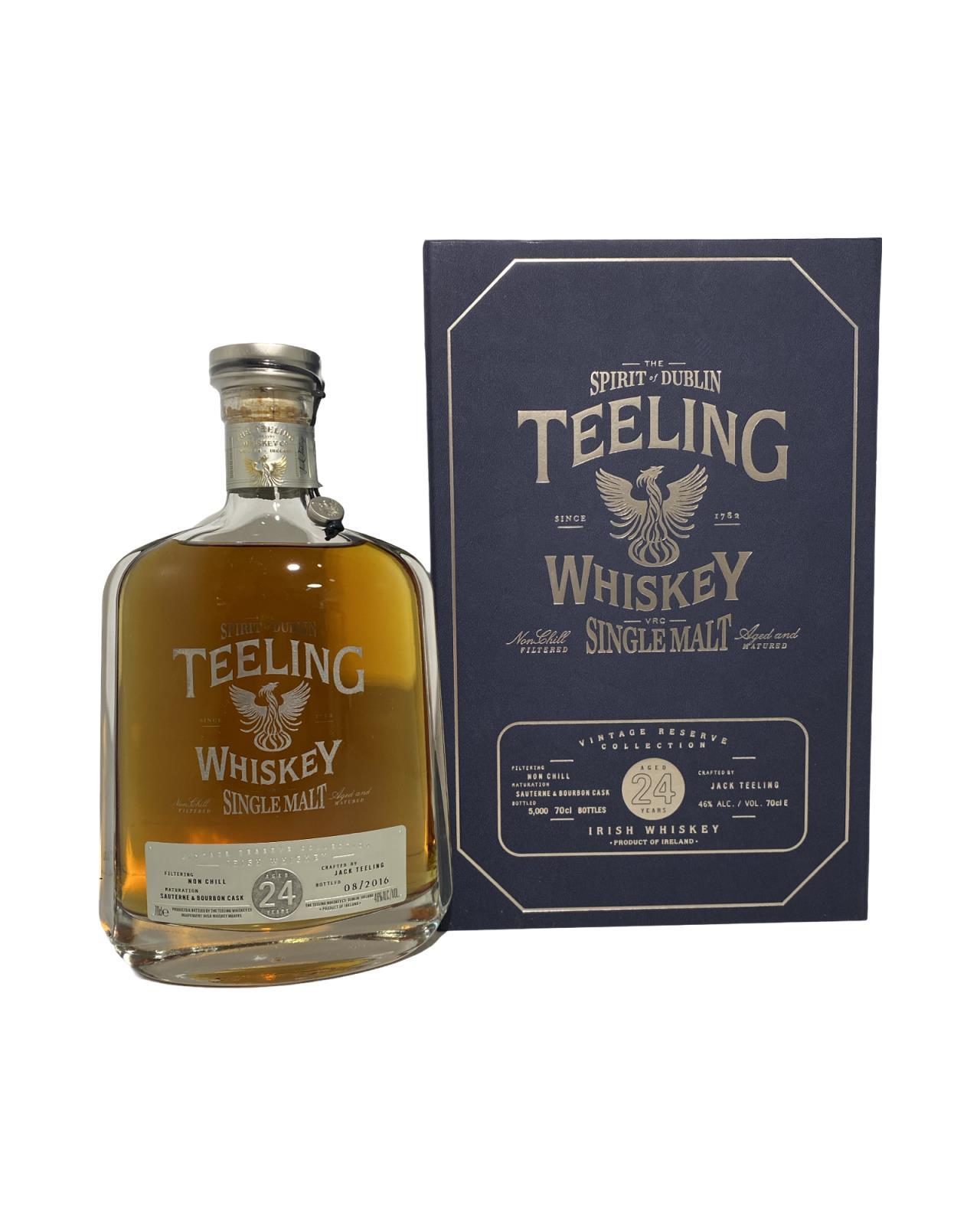 The Teeling 24 Year Old Single Malt Irish Whiskey was first distilled in 1991 and matured in Bourbon casks then allowed marry in Sauternes wine casks producing a wholly unique taste experience. The unique dual maturation imparts an extra depth of fruit flavours that perfectly complement the hint of smoke derived from the inclusion of a small portion of Peated malt as part of the original ingredients used in production. This small batch bottling, limited to just 5,000 70cl bottles, were hand bottled in unique decanter bottles and come with their own certificate of authenticity. This was awarded the title of World’s Best Irish Single Malt, this is a whiskey to be savoured. Teeling Whiskey and the Teeling Distillery are integral parts of Ireland's whiskey renaissance. Founded by the Teeling family in 2012, the distillery is located in the heart of Dublin, the first new distillery in the city in over 125 years. Teeling Whiskey stands out for its innovative approach to Irish whiskey production. The distillery prides itself on handcrafted, small-batch spirits that combine traditional methods with a contemporary twist. They focus on utilizing a diverse range of cask types for maturation, resulting in whiskies with unique and complex flavour profiles. In addition to their core range, Teeling offers limited edition releases and single malt expressions that further showcase their commitment to quality and experimentation. Of course, most of their older expressions are bottled from mature stock from other distilleries (such as Bushmills and Cooley), but we are also starting to see excellent releases from the Dublin distilled inventory.