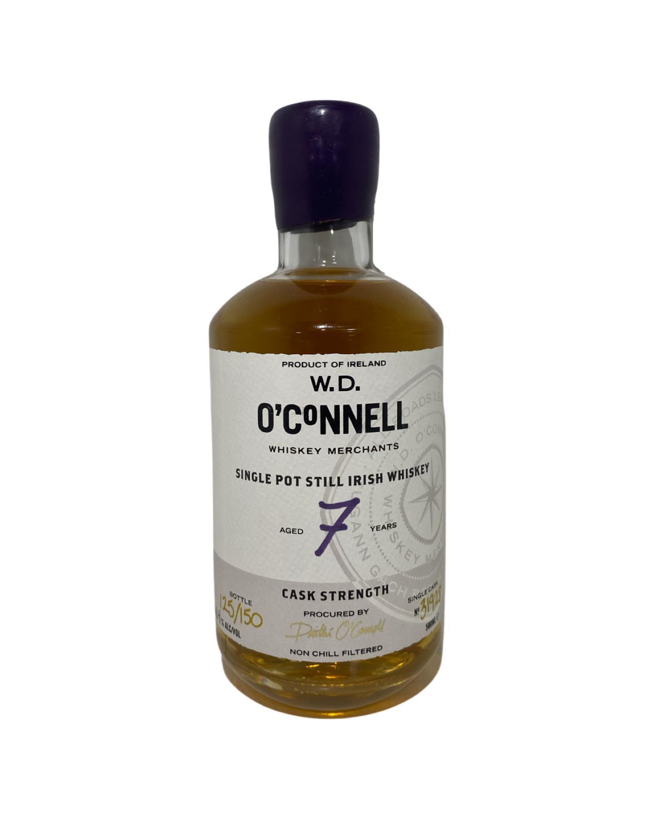 A 7 Year Old Single Pot Still from W.D. O'Connell. This is a Cask Strength Non Chill Filtered whiskey. W.D. O’Connell Whiskey Merchants are an independent whiskey company. They procure premium new make spirit and aged whiskies from multiple distilleries and apply their own maturation and finish preferences. They source casks and mature and bottle the finished whiskies when they are ready.