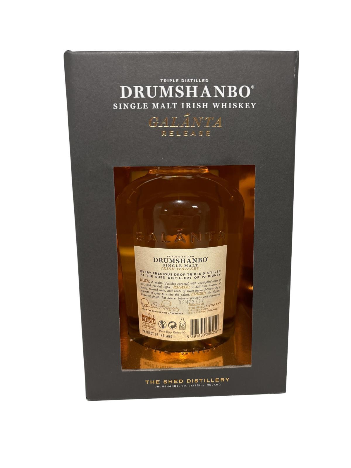 Following the success of their 2021 release, Master Distiller Brian Taft at The Shed Distillery of PJ Rigney has released this year's installment. Drumshanbo Single Malt Galanta is a limited annual vintage whiskey of approx 1700 bottles in the Irish market. Matured in Single Use Kentucky Bourbon casks and boasts an intriguing balance of vanilla and wood spice.
