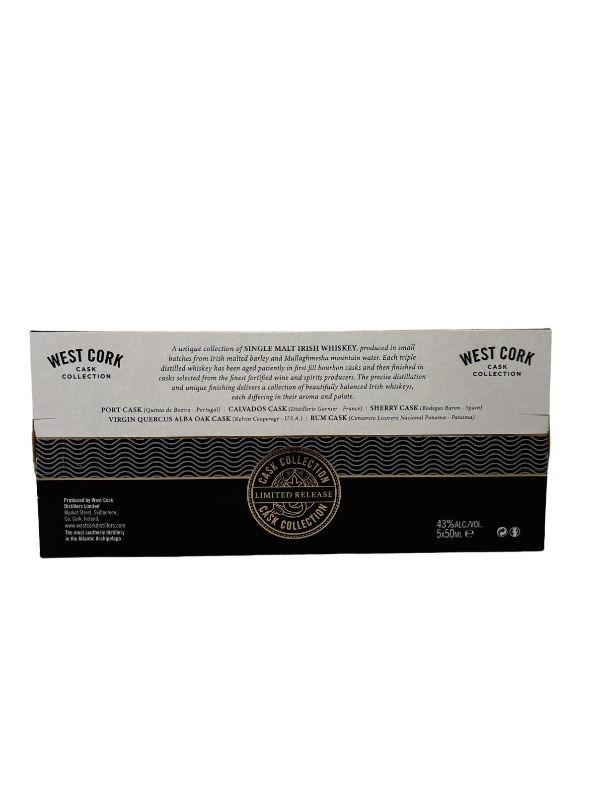 The West Cork Cask Finishes Minis Sets is a unique collection of single malt Irish whiskey, produced in small batches from Irish malted and Mullaghmesha mountain water. Each whiskey has been aged in first-fill bourbon casks and then finished in casks selected from the finest fortified wines and spirits. The precise distillation and unique finishing delivers a collection of beautifully balanced Irish whiskeys, each differing in their aroma and palate. This set contains single malt rum cask finish, single malt sherry cask finish, single malt port cask finish, single malt virgin oak cask finish and single malt calvados cask finish. Port Cask (Quinta de Boeira – Portugal) | Rum Cask (Consorcio Licorero Panama – Panama) | Sherry Cask (Bodegas Baron – Spain) | Calvados Cask (Distillerie Garnier – France) | Virgin Quercus Alba Oak Cask (Kelvin Cooperage – U.S.A)”