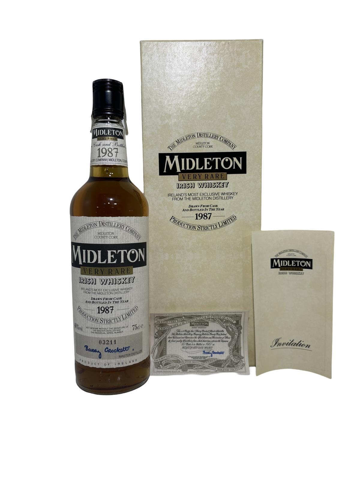 The Midleton Very Rare 1987, is a bottling brought out by the Midleton Distillery in Co. Cork. The ‘Midleton Very Rare’ range was launched in 1984 and a new vintage has been released every year since then. Barry Crockett started off the ‘Midleton Very Rare’ range while he was the Master Distiller of Midleton Distillery,the highly sought-after Midleton Very Rare 1989. The bottle is in excellent condition and comes with the original distillery invite and certificate.